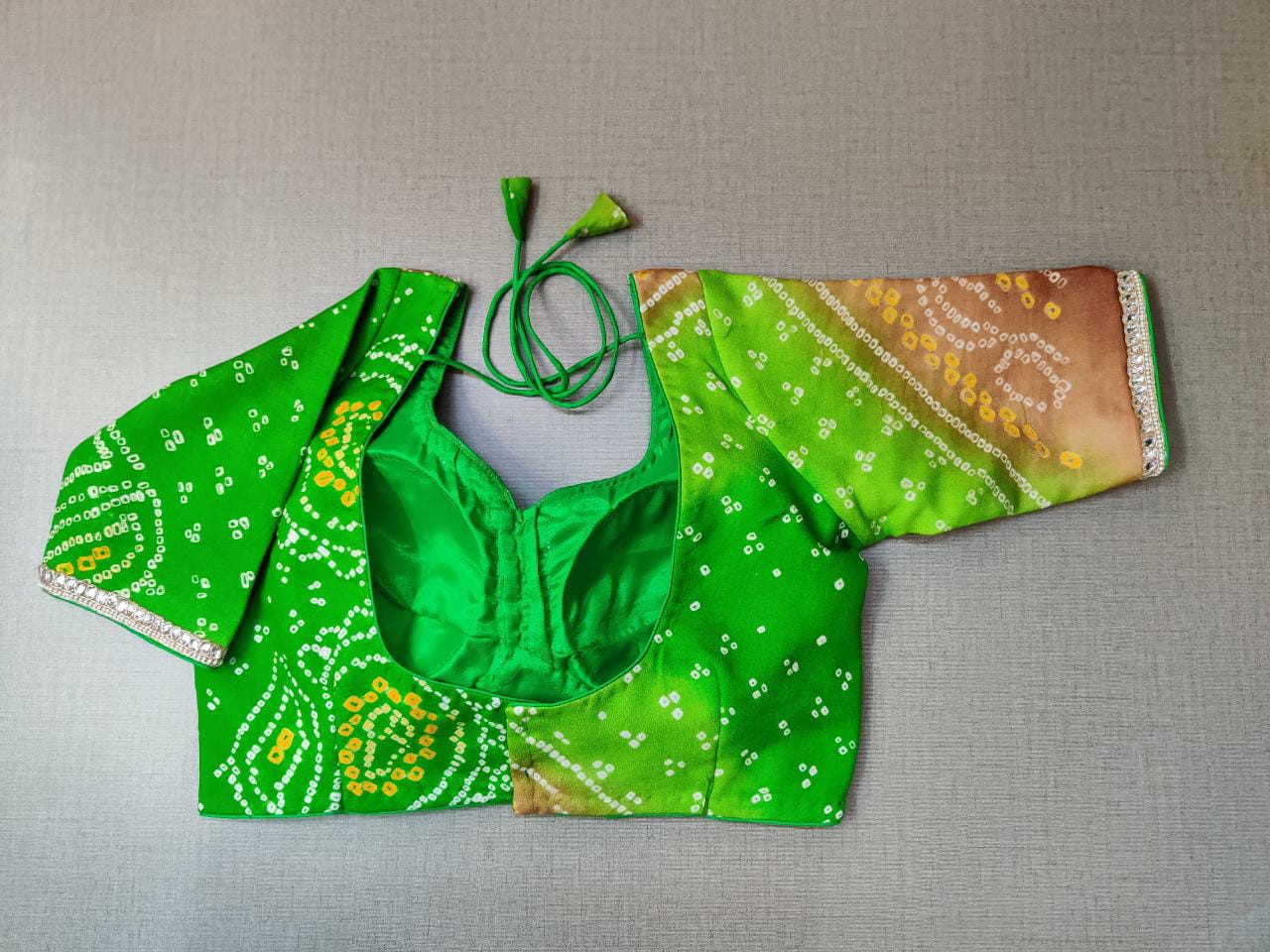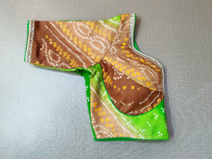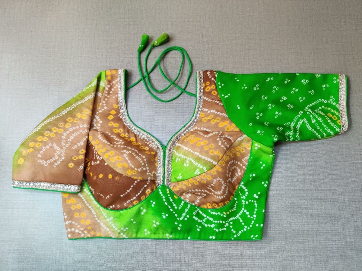 Beautiful green & brown color Indian saree designer blouse with bhandej pattern. You can pair up with any Indian Saree for any Indian festival occasion to make your look elegant. This blue blouse is a woven design padded saree blouse that has a beautiful neck, a U shape back, and hook closure. Buy this designer blouse in the USA from Pure Elegance.