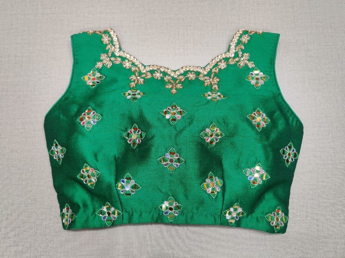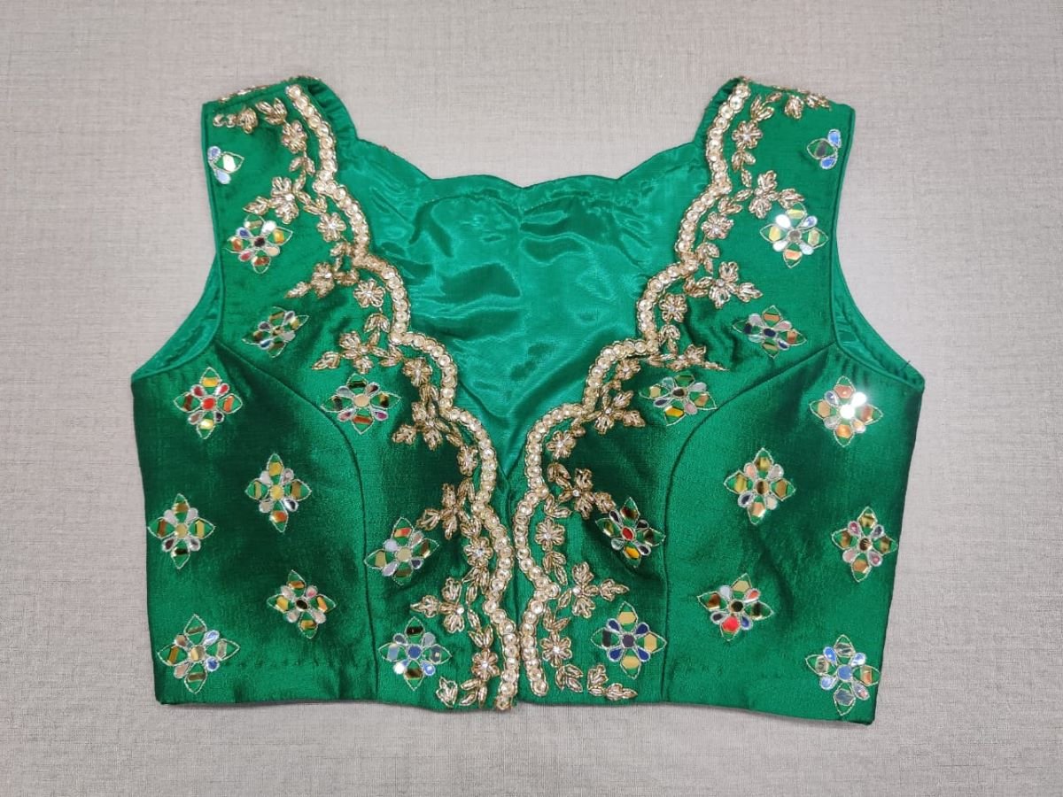 Exquisite green color mirror work designer. It has a beautiful V-neck and hook closure. Pairs it with a contrasting saree to make your look more graceful. Perfect blouse for cocktail parties. Buy this designer blouse in the USA from Pure Elegance.