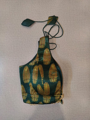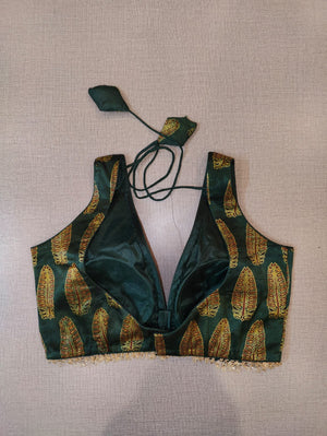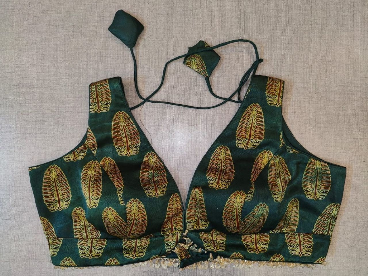 Festive essentials get an elevated twist with this green leaf-printed blouse. Featuring the blouse is cut with a V-neck, hook closure, and tie-up and is sleeveless. Wear it with a contrasting saree to complete the look. Buy this designer blouse in the USA from Pure Elegance.