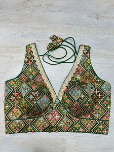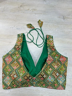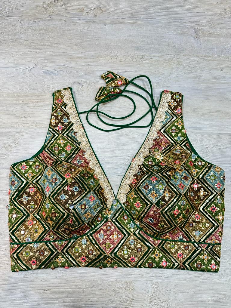 Green multicolored embroidered sleeveless blouse features thread & mirror work, hook closure & tie-up at the back. Team this blouse with a contrasting saree to look gorgeous and create a stunning and beautiful look. Buy this designer blouse in the USA from Pure Elegance.
