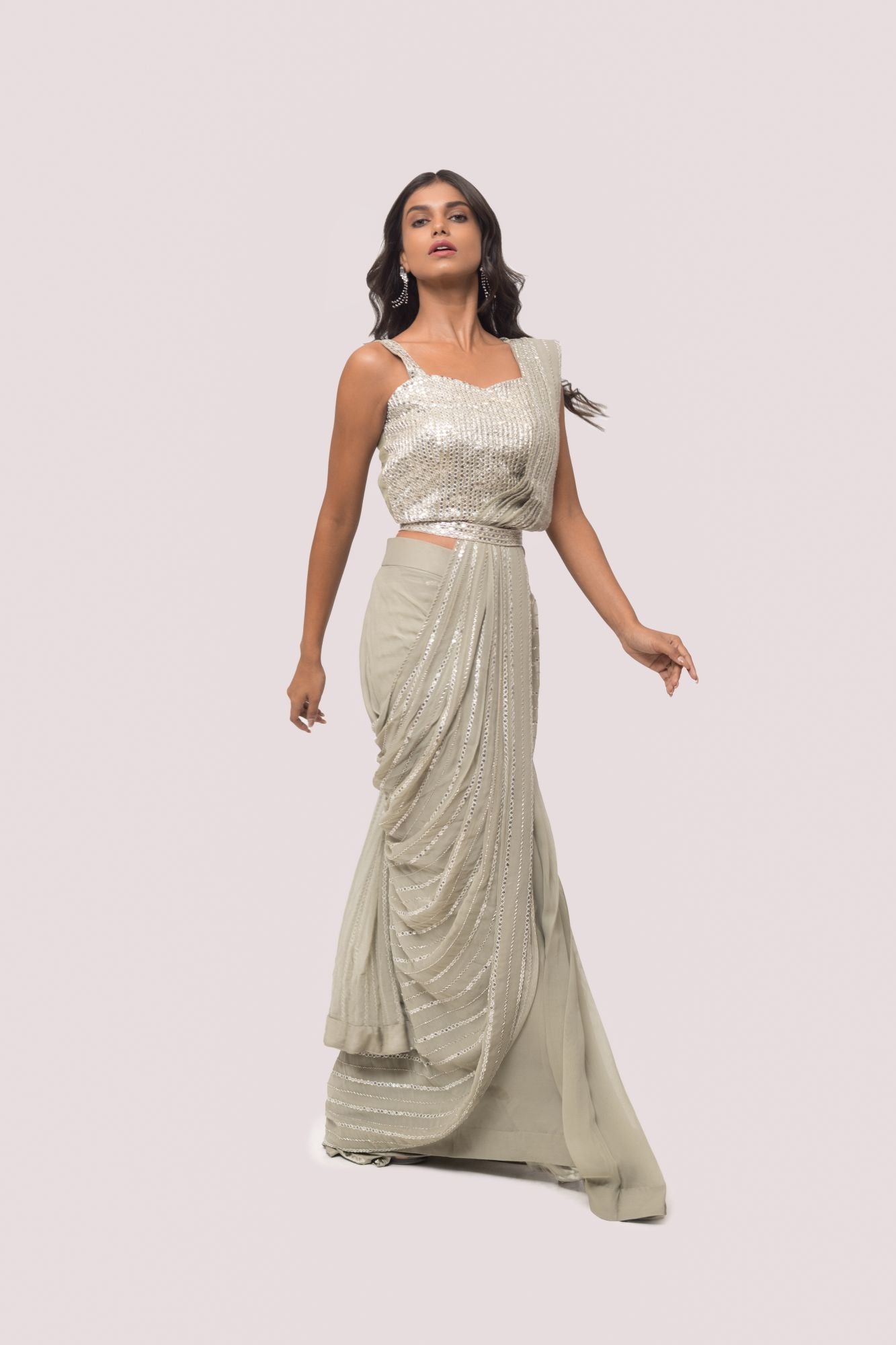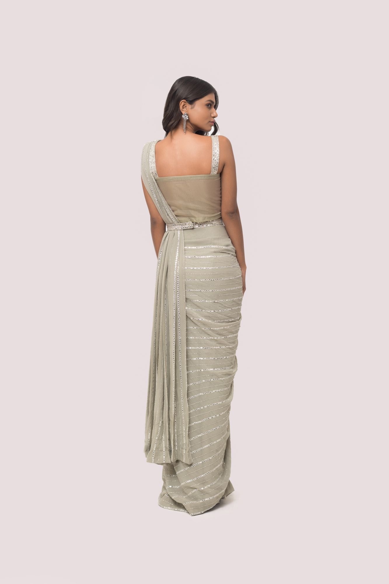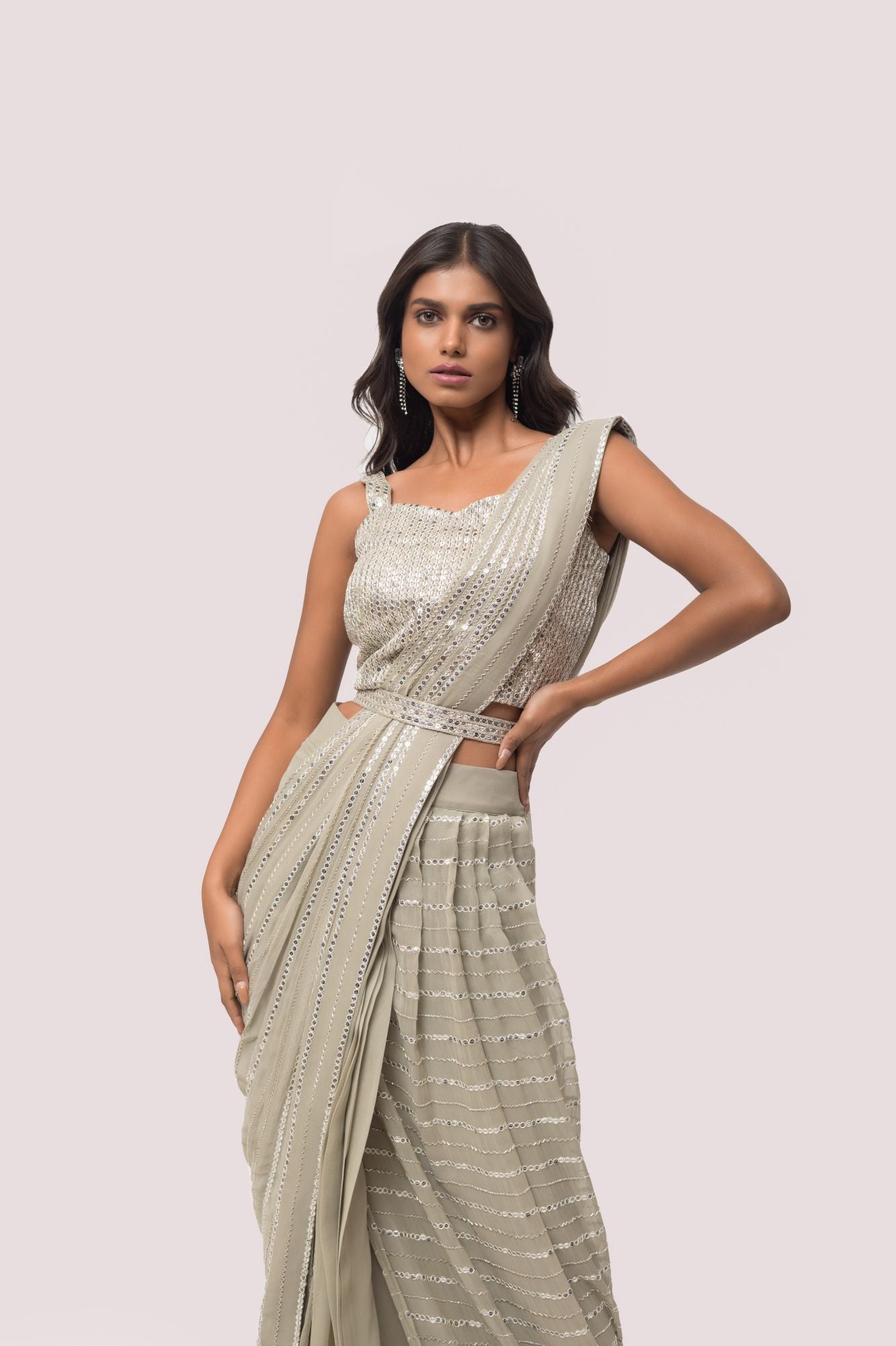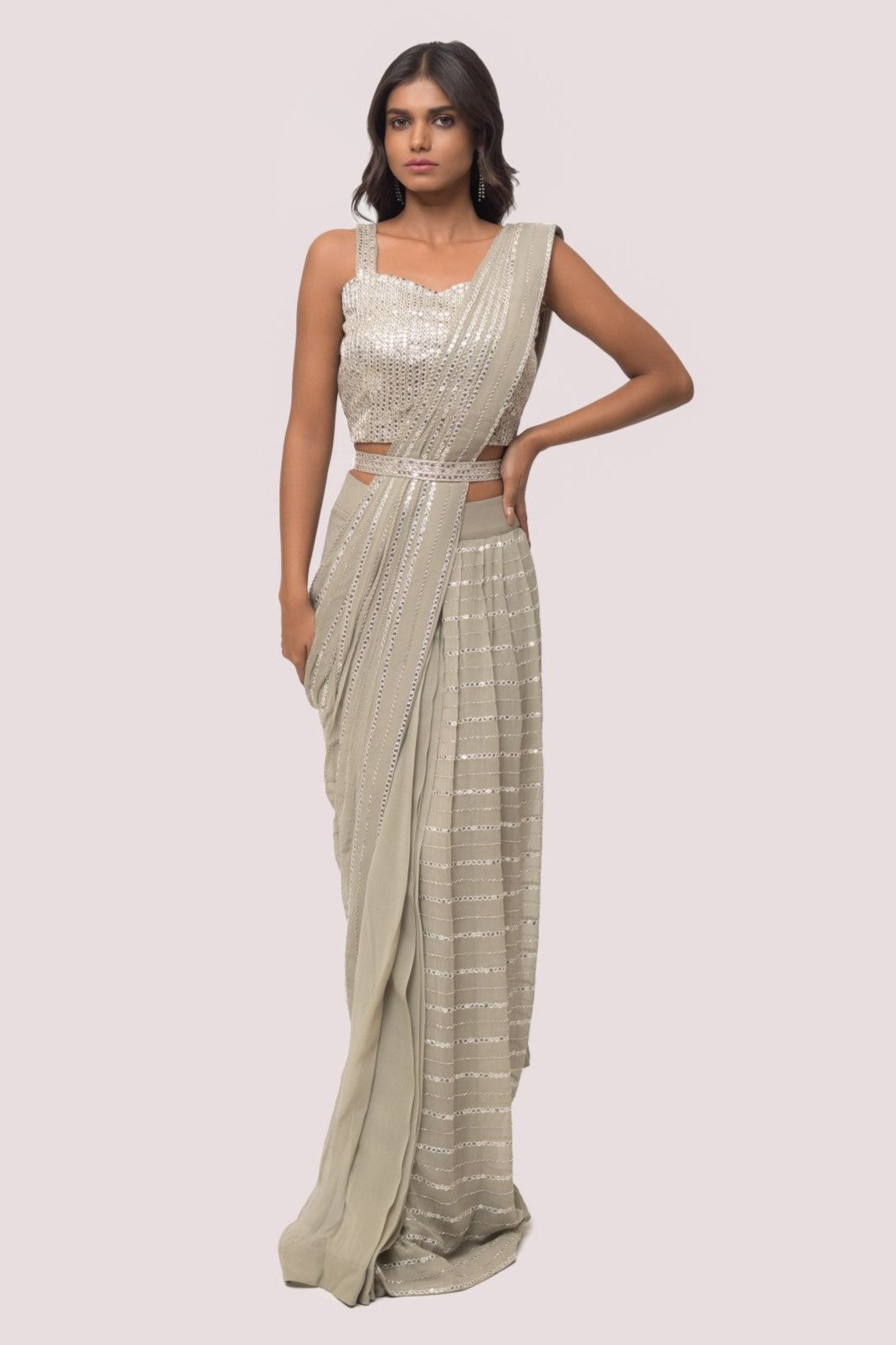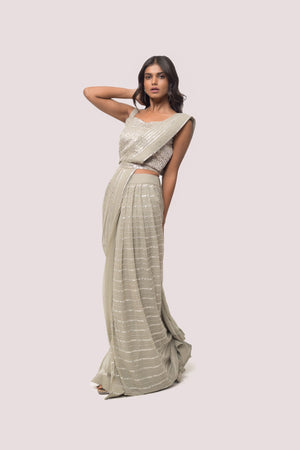Grey georgette embroidered saree featuring cut dana, and mirror work. It comes with a sleeveless embroidered designer blouse. Shop designer saris online in the USA from Pure Elegance.
