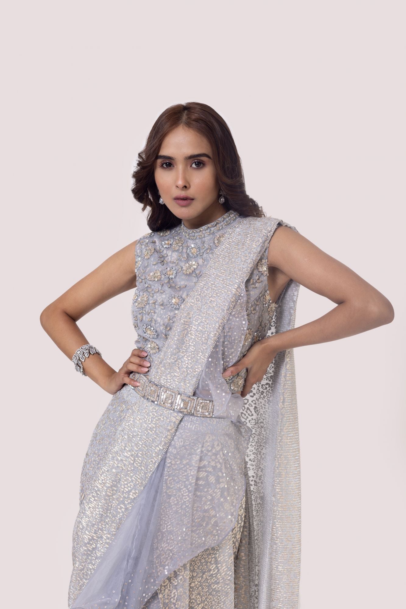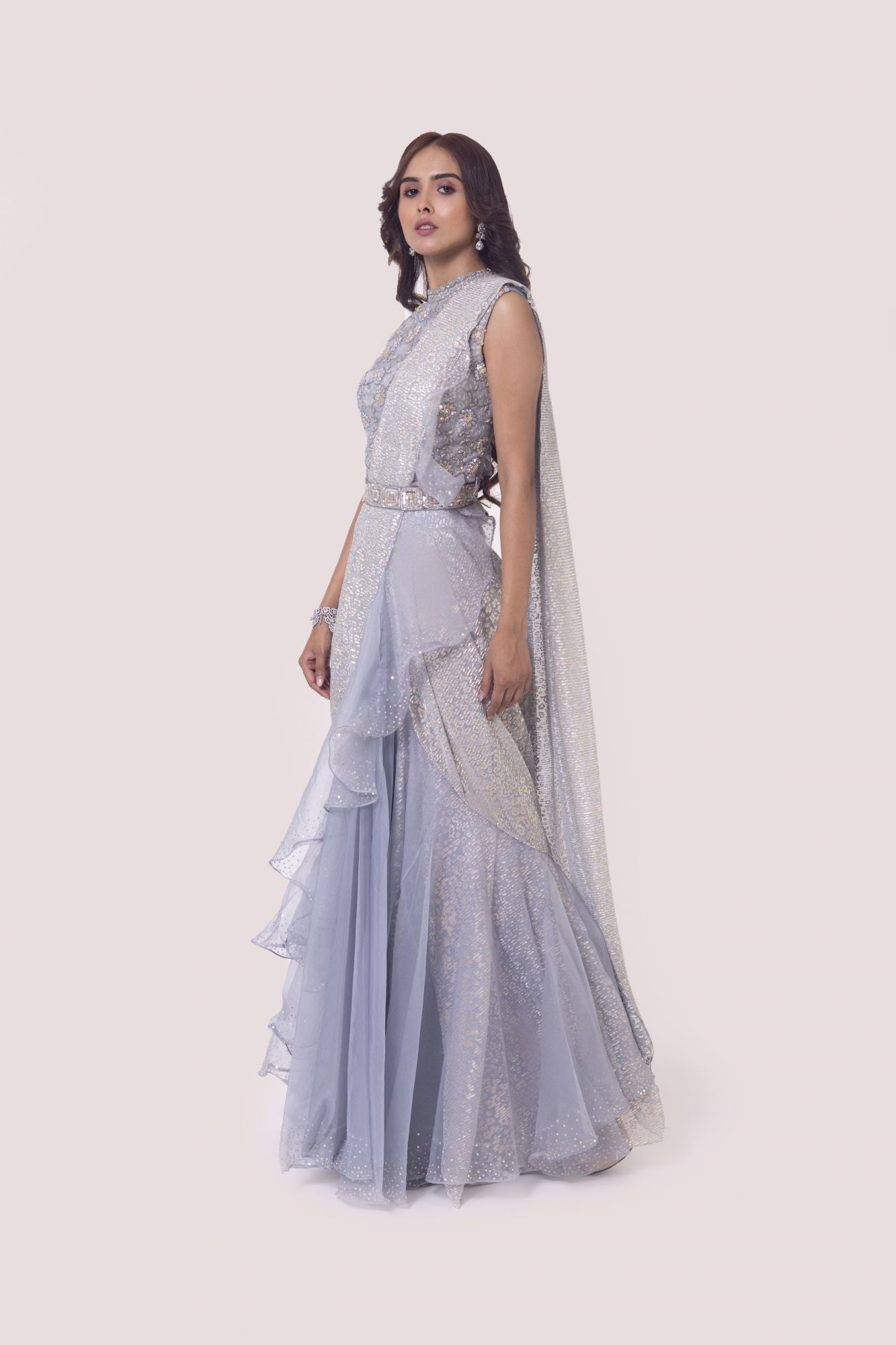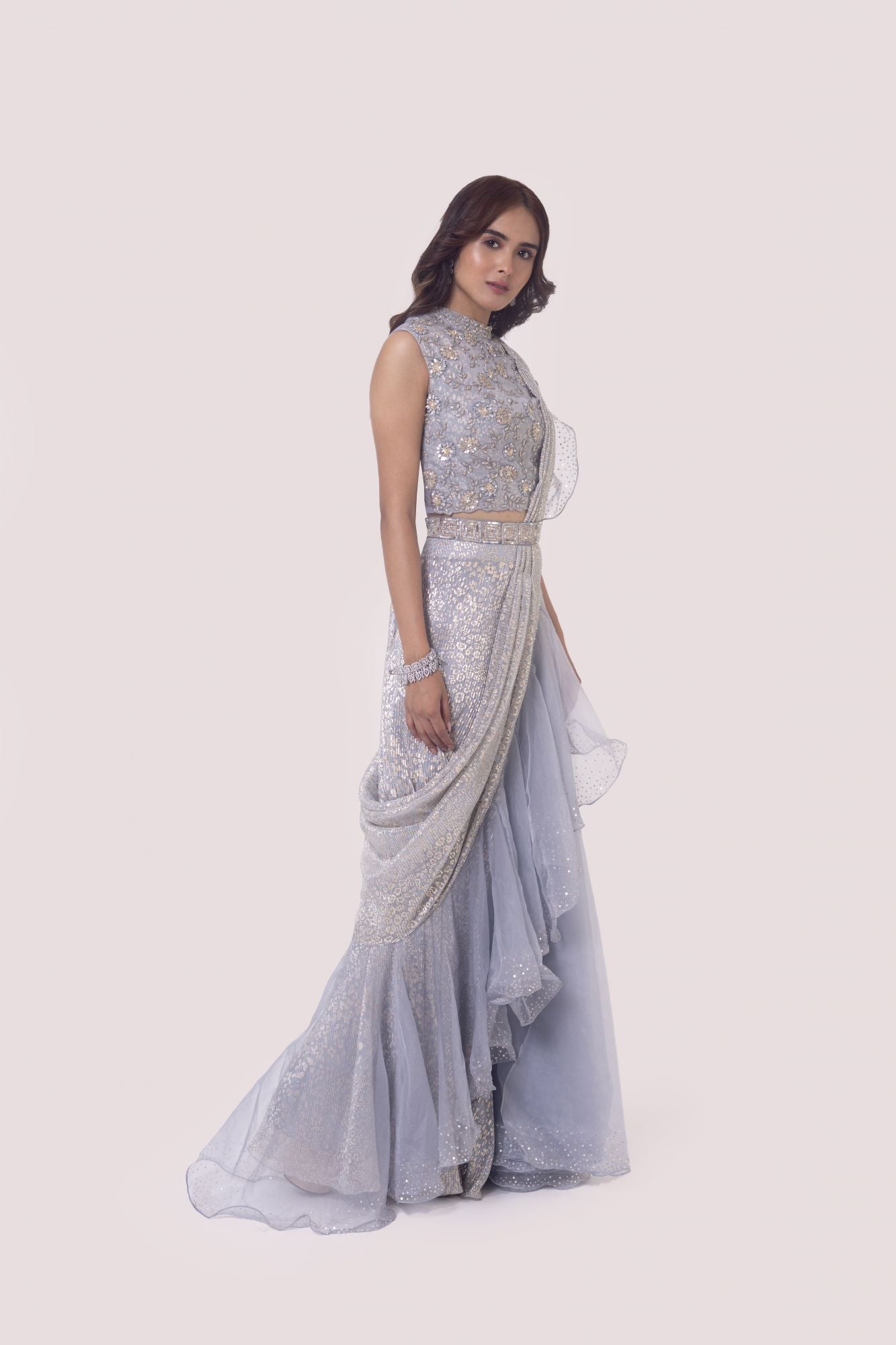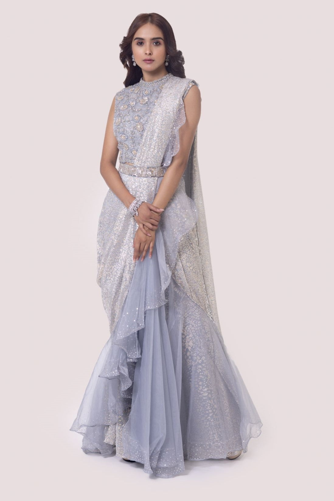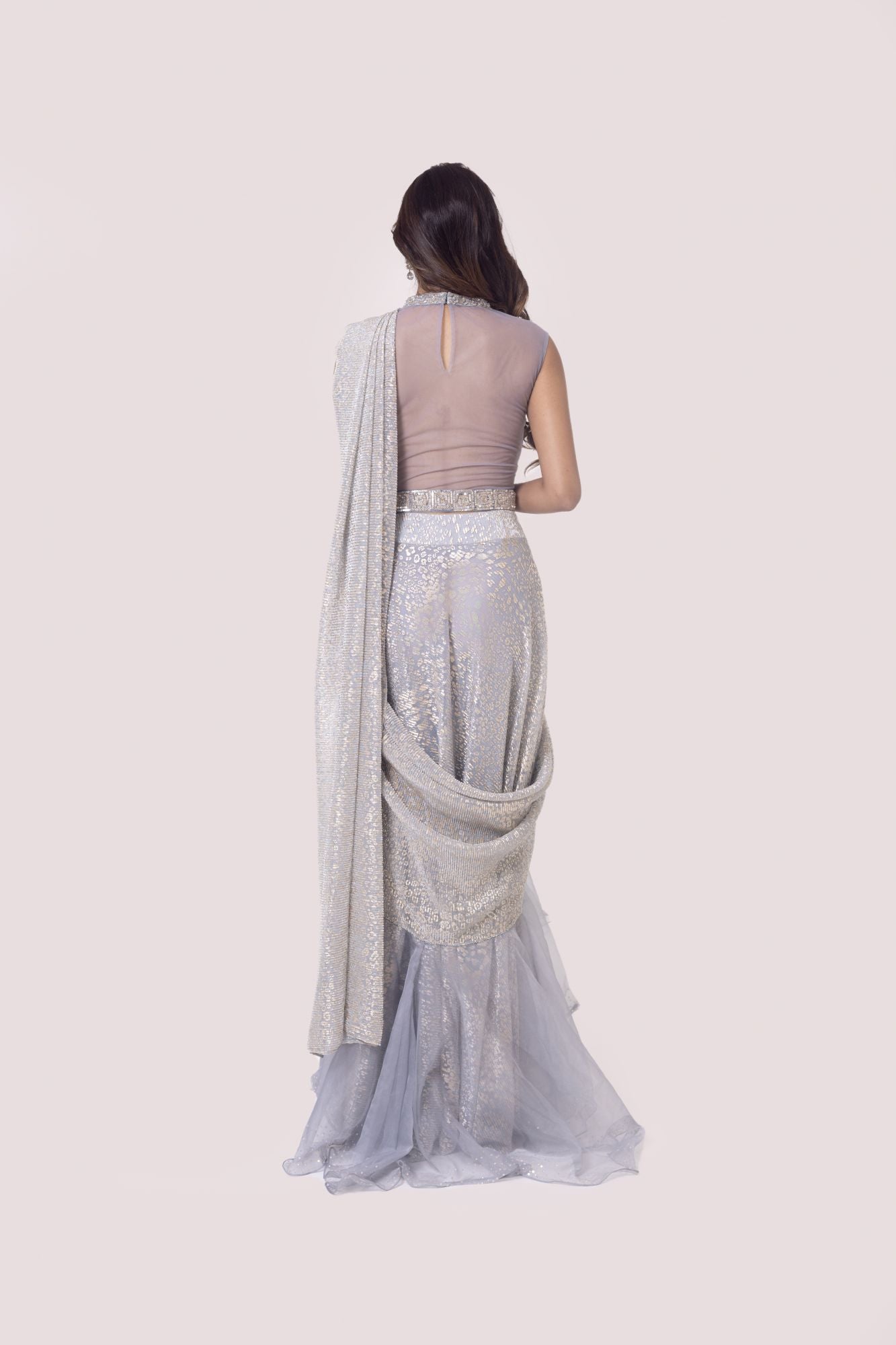 Silver grey beautiful designer drape saree set. It comes with a sequine and cutdana embroidery with embroidered blouse and belt. Shop designer saris online in the USA from Pure Elegance.