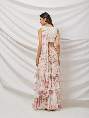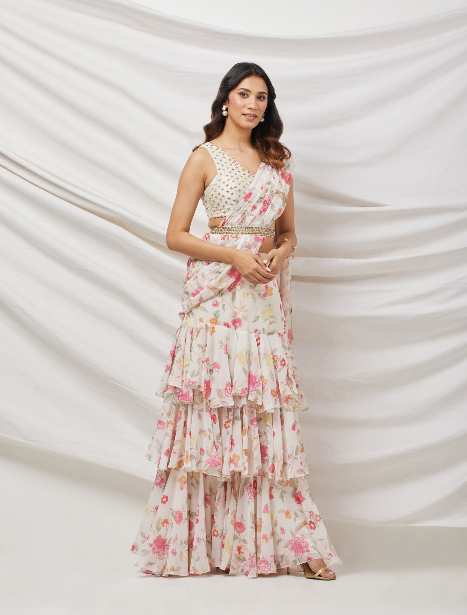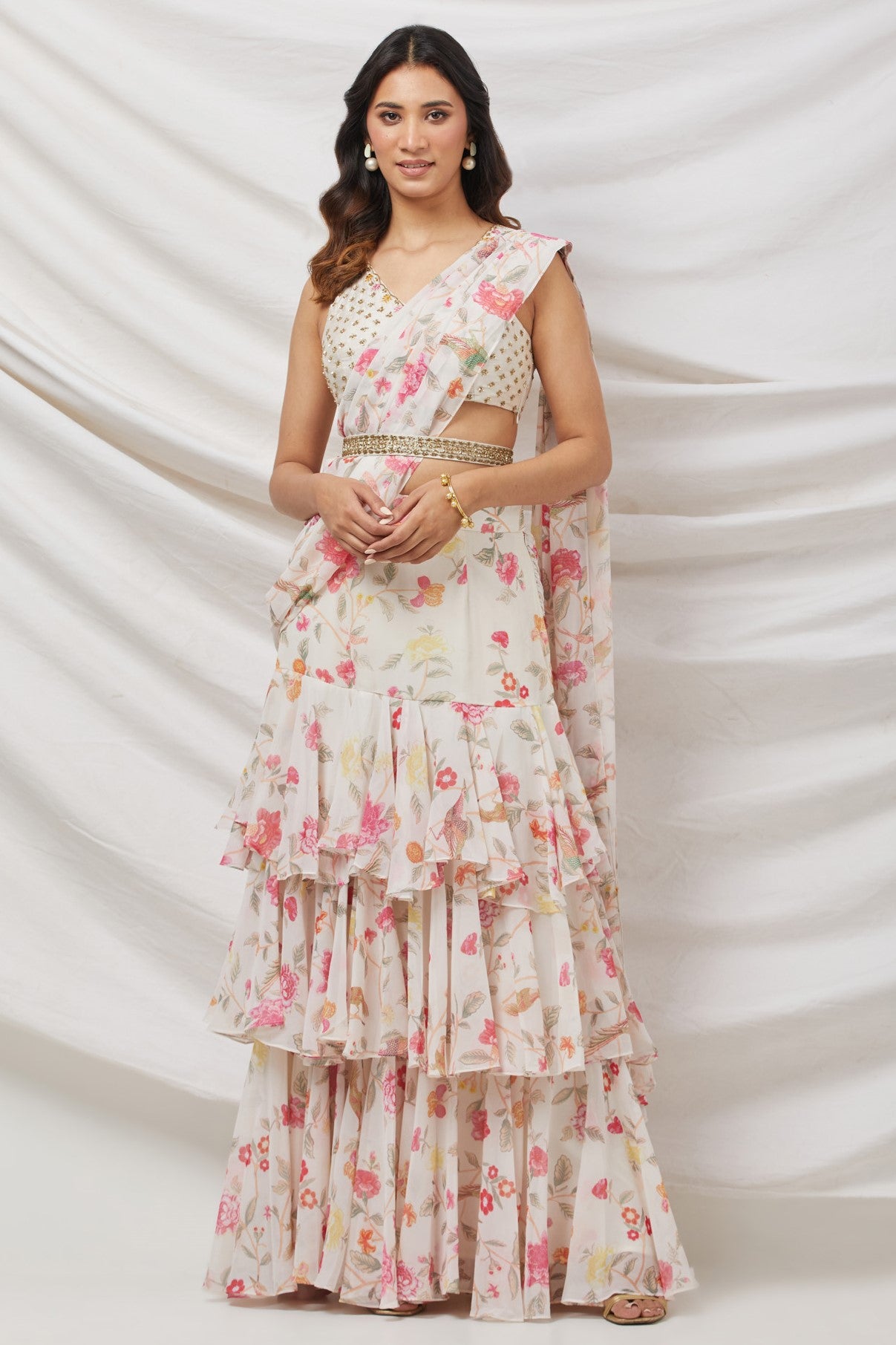 Ivory ruffle easy to drape saree set featuring sequins, cut dana, and zari work. Paired with a belt that adds definition and glamour. Shop online from Pure Elegance.