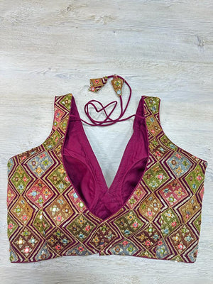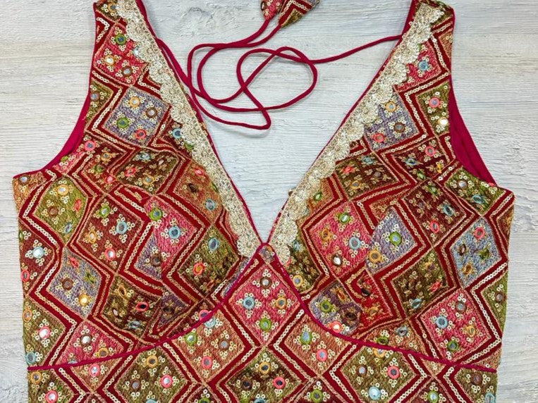Maroon multicolored embroidered sleeveless blouse features thread & mirror work, hook closure & tie-up at the back. Team this blouse with a contrasting saree to look gorgeous and create a stunning and beautiful look. Buy this designer blouse in the USA from Pure Elegance.