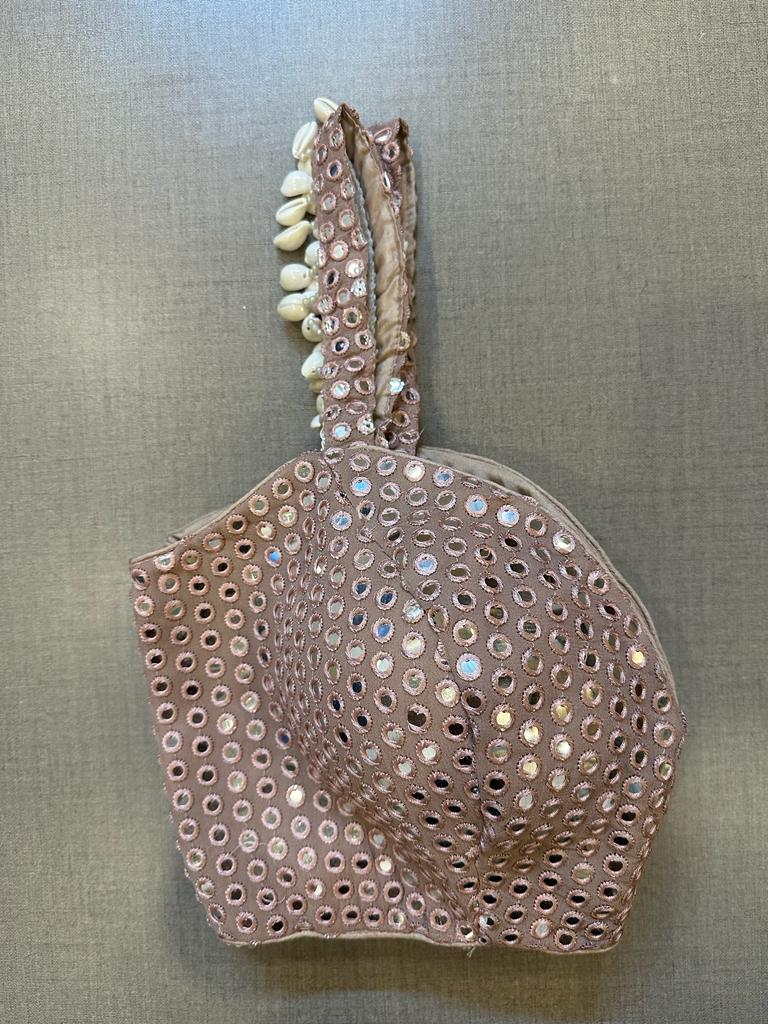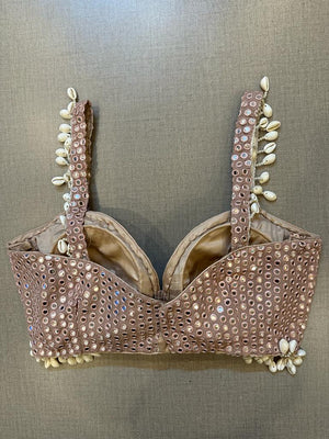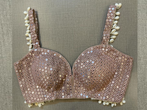 Mauve pink sequinned silk blouse embroidery, hanging pearls strappy sleeves, and hook closure. Team this blouse with a contrasting saree to look gorgeous and create a stunn55