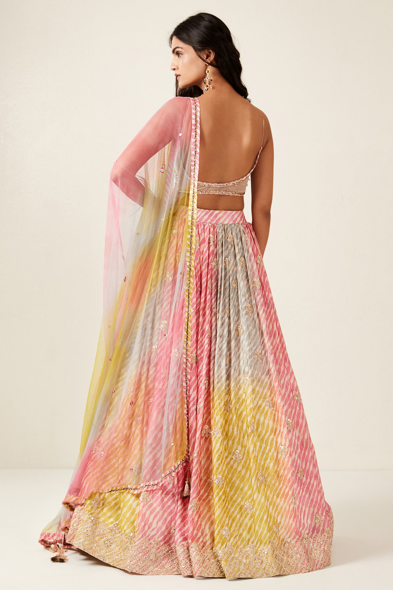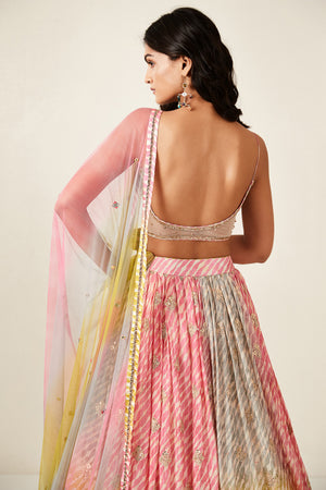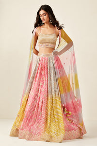 Look your best on wedding occasions in this beautiful multi color lehenga with france cut and mirror embroidery, cut dana, and a beautiful blouse. Dazzle on weddings and special occasions with exquisite Indian designer dresses, sharara suits, Anarkali suits, bridal lehengas, and sharara suits from Pure Elegance Indian clothing store in the USA. Shop online from Pure Elegance.
