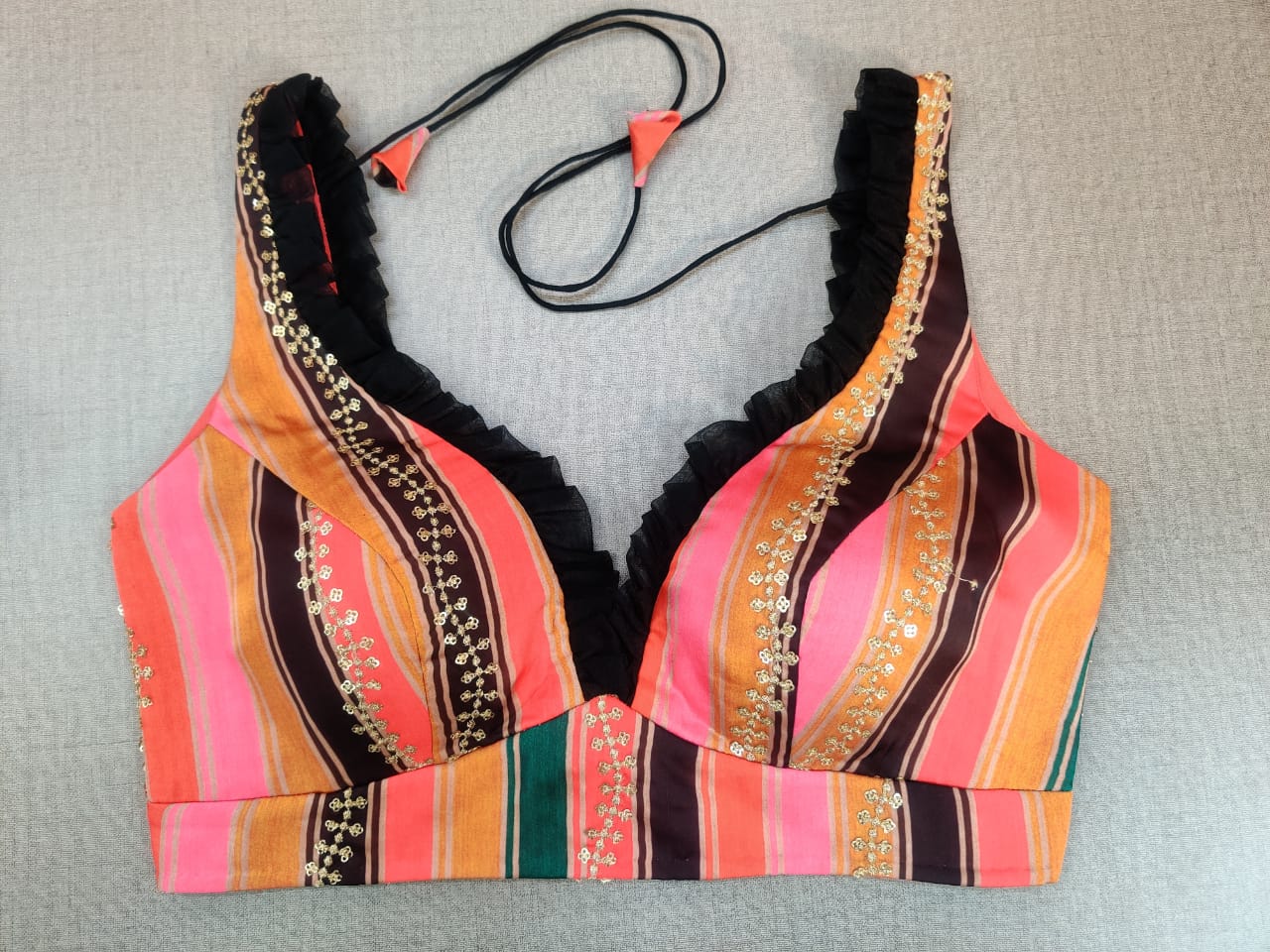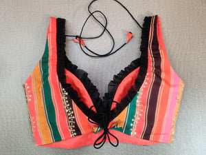 Multi-Color blouse crafted in hammered silk with beautiful golden embroidery work and frills all around the neck. Tailored with strappy shoulders, the blouse features a smocked back for comfort and style, and a tie-up closure. Give your ethnic look a dazzling update with this multi color blouse. Buy this designer blouse in the USA from Pure Elegance.