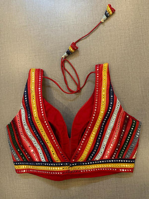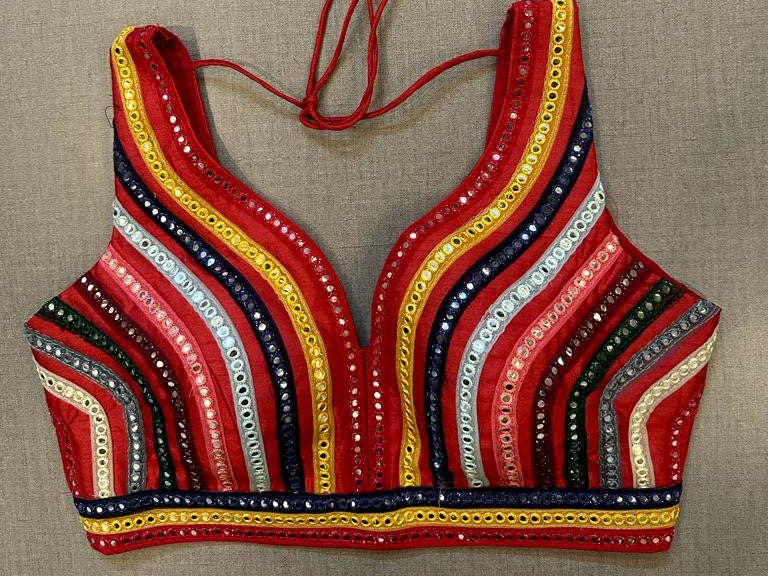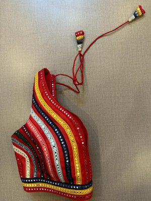 Multicolor silk blouse with Mirror work, sleeveless, tie up with tassle and hook closure. Team this blouse with a contrasting saree to look gorgeous and create a stunning look.
