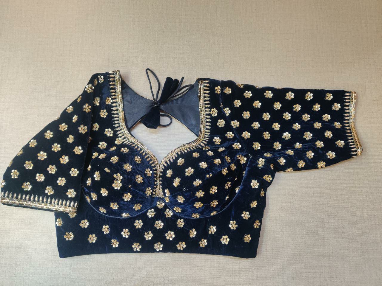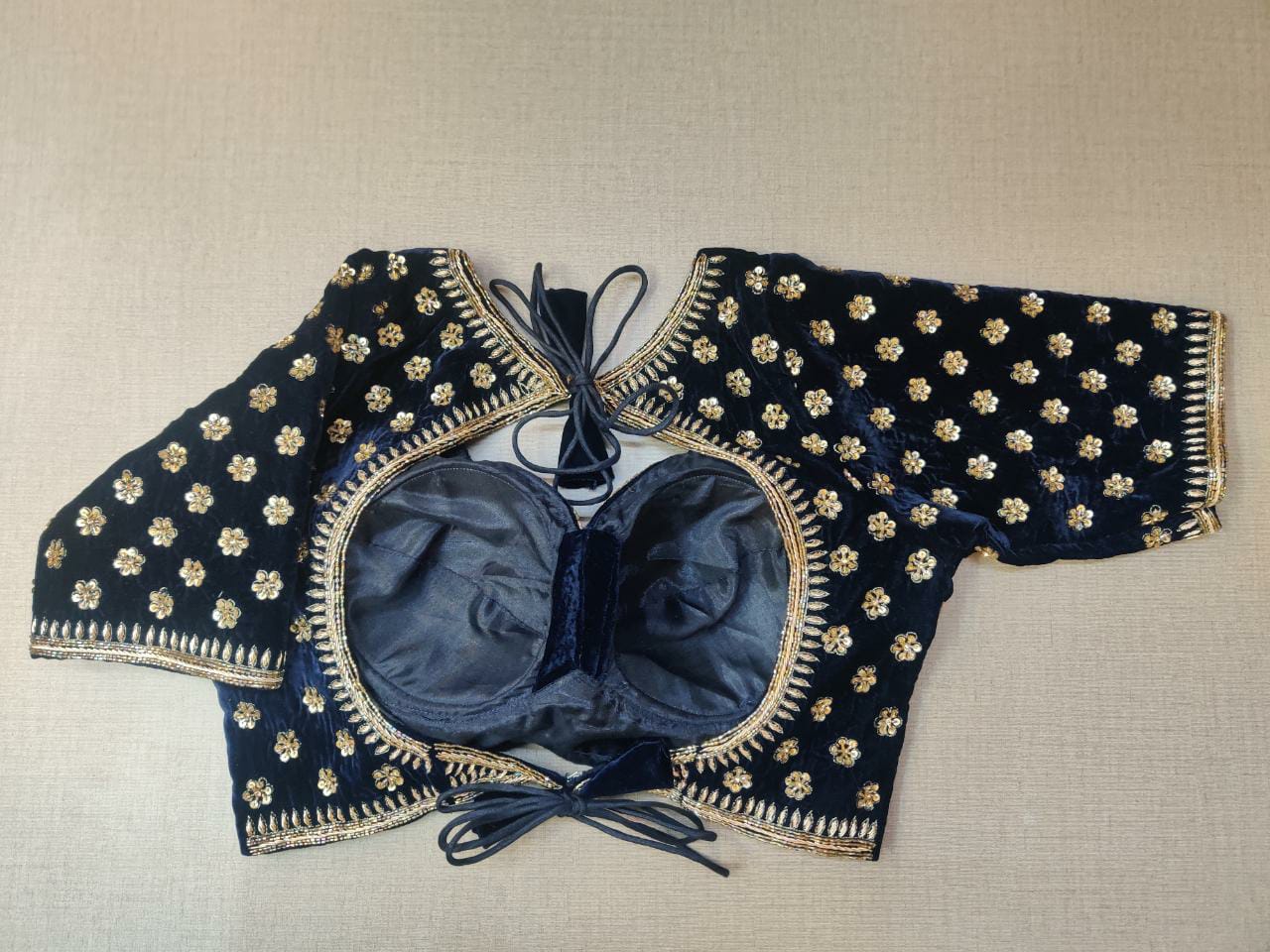 Add a touch of serenity to your festive ethnic look with this soothing navy blouse. Crafted in a velvet silk blouse, it is embellished with intricate zari embroidery, 3/4th sleeves, and a tie-up closure for making the blouse more elegant. Buy this designer blouse in the USA from Pure Elegance.