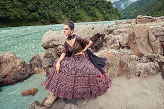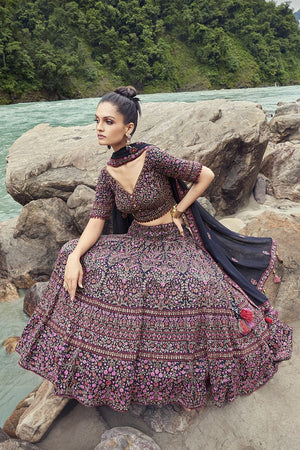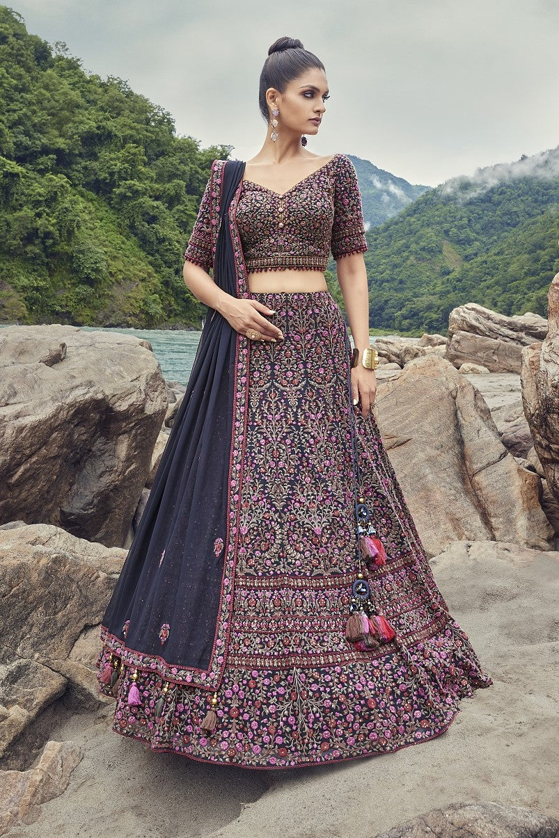 Beautiful navy blue lehenga with floral embroidery and georgette dupatta with tassels. The lehenga is perfect for a wedding night. Shop online from Pure Elegance.