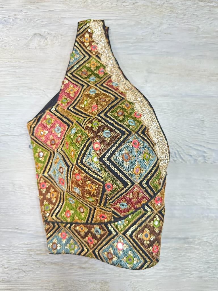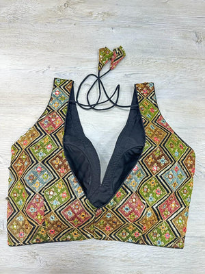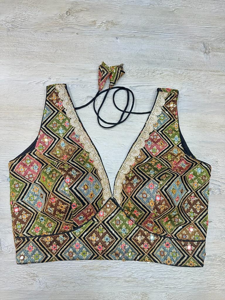 Navy multicolored embroidered sleeveless blouse features thread & mirror work, hook closure & tie-up at the back. Team this blouse with a contrasting saree to look gorgeous and create a stunning and beautiful look. Buy this designer blouse in the USA from Pure Elegance.