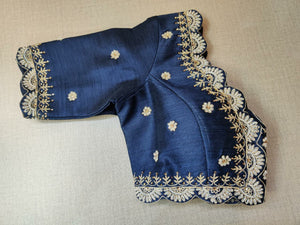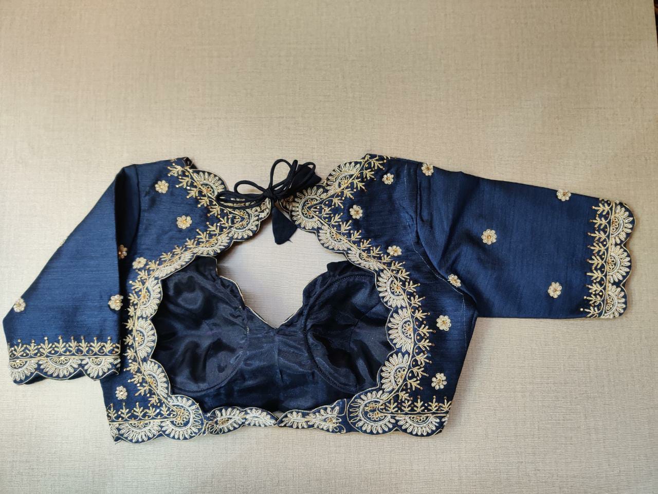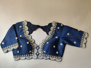 Classic is never old and enough to have in your closet!! Pair this fashionable navy blouse with a beautiful embroidery sari and statement neck piece and you are good to go! It has a beautiful back with a hook closure and tie-up at back. Buy this designer blouse in the USA from Pure Elegance.
