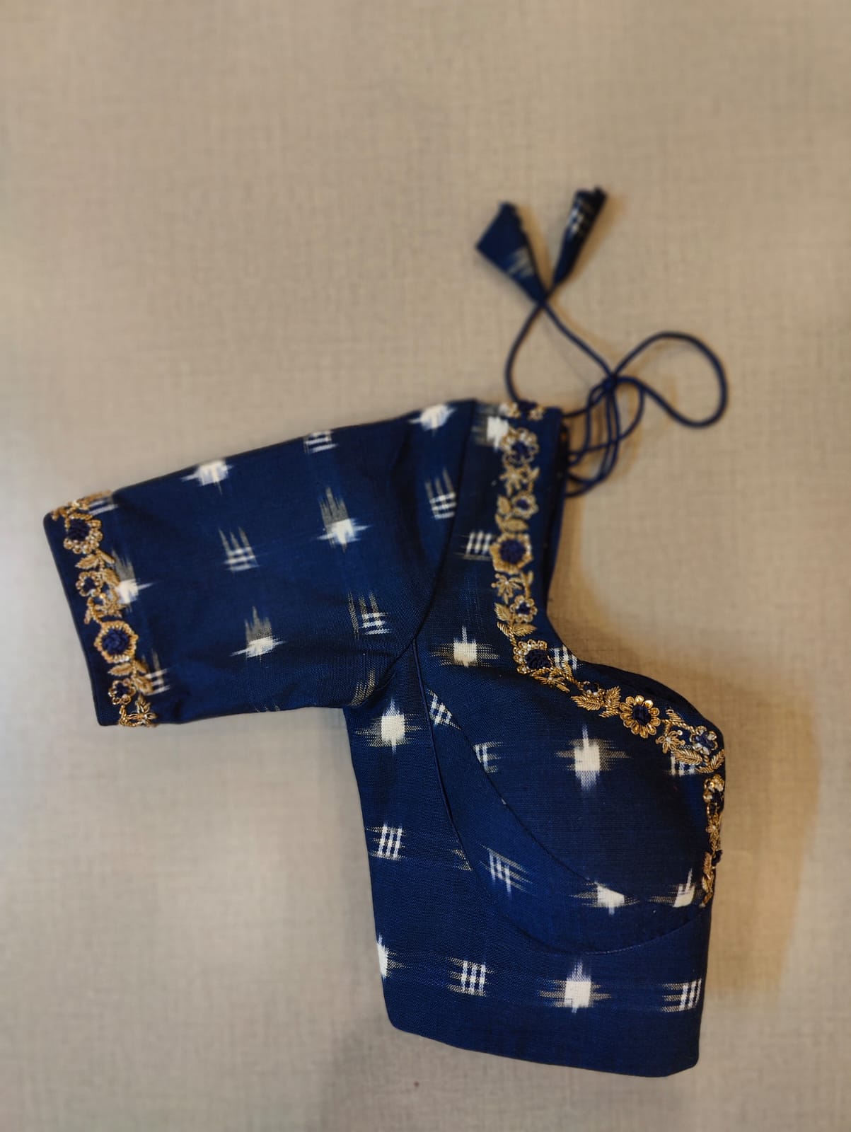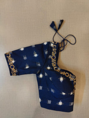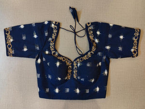 With its timeless color and striking details, this navy blouse is designed to amp up even the simplest of separates. Tailored zari work with a chic cut, it features a densely white patch & embroiderey, U back, hook, and tie-up closure. Complete the look with a cocktail sari. Buy this designer blouse in the USA from Pure Elegance.