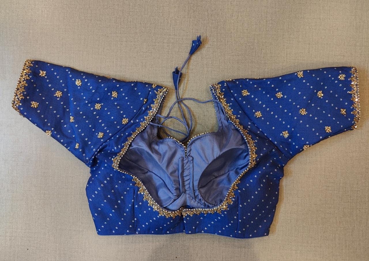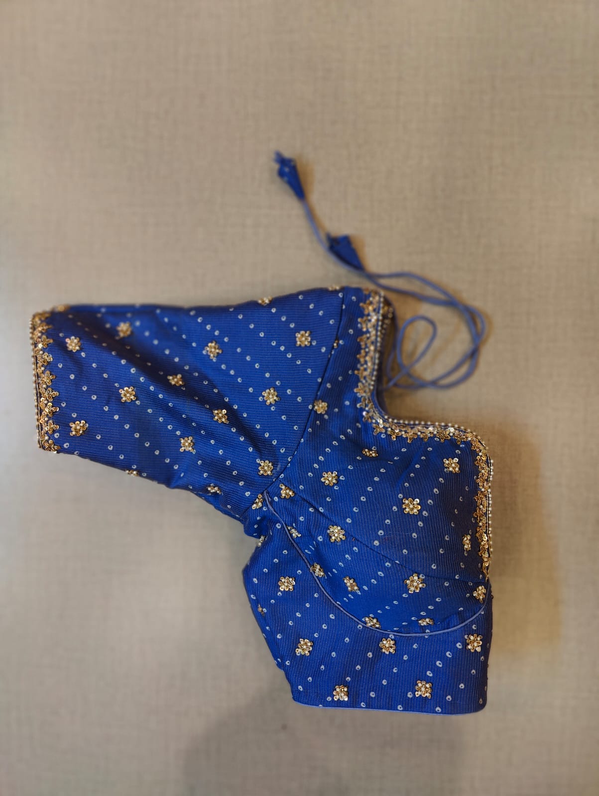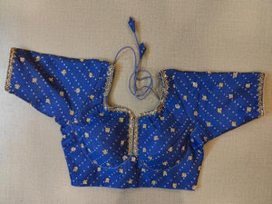 Festive essentials get an elevated twist with this navy bandhej print zari embroidered blouse. Featuring an embroidered front & back, the blouse is cut with a U-neck, short sleeves, hook closure, and tie-up. Wear it with a contrasting saree or even with a contrasting lehenga skirt to complete the look. Buy this designer blouse in the USA from Pure Elegance.