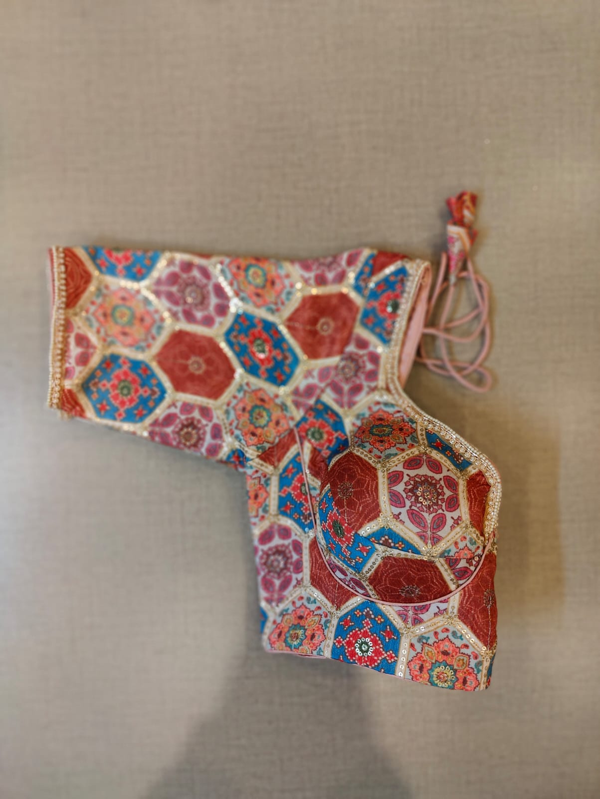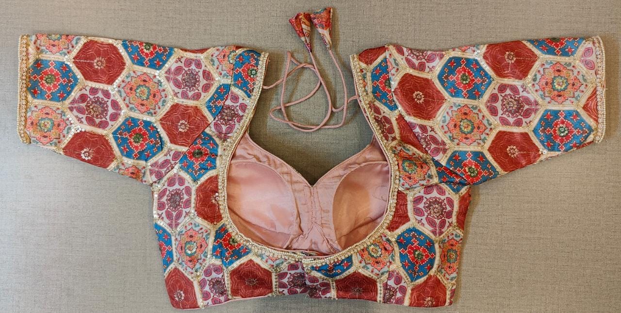 Women's off-white Ajrakh Block & ptch printed, padded Saree Blouse, has round neck, Hook & tie-up closure at back with 3/4th sleeves. Classic is never old and enough to have in your closet!! Pair this fashionable blouse with a beautifully printed sari and statement neckpiece and you are good to go! Buy this designer blouse in the USA from Pure Elegance.