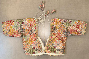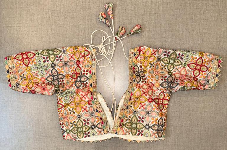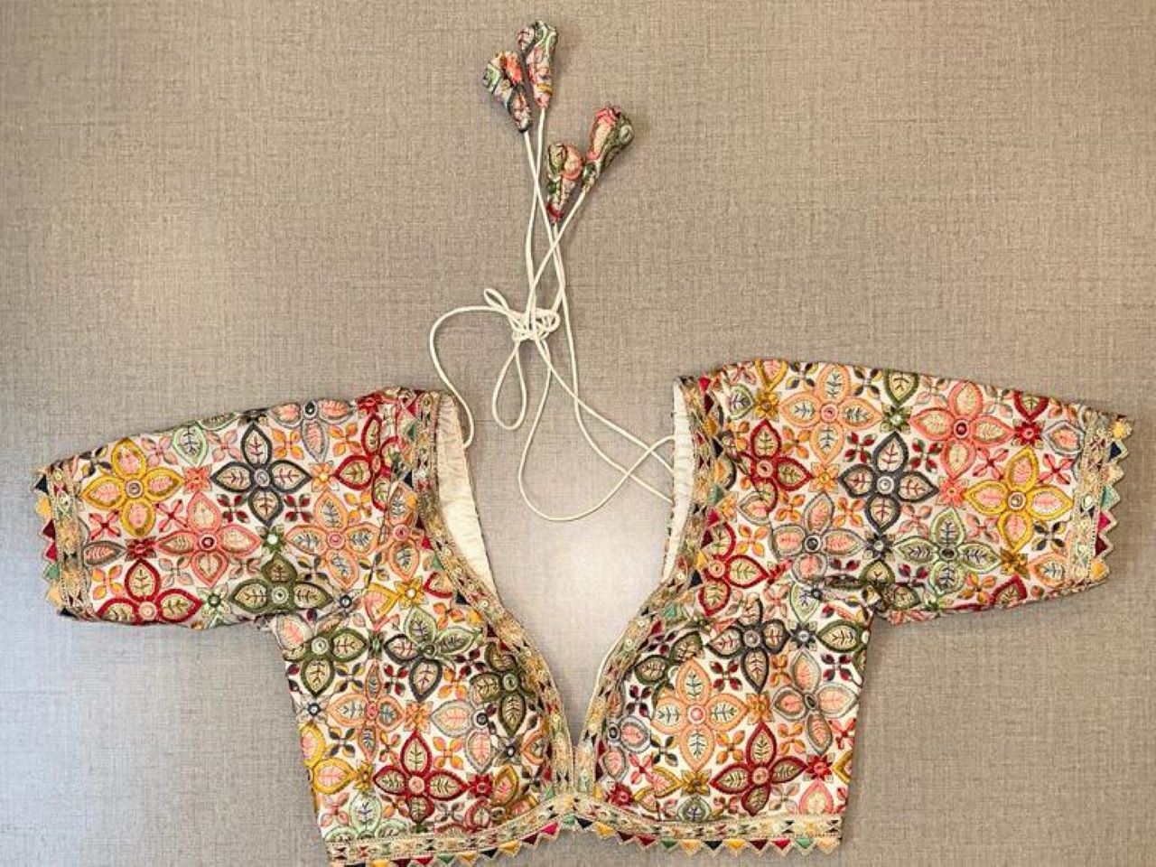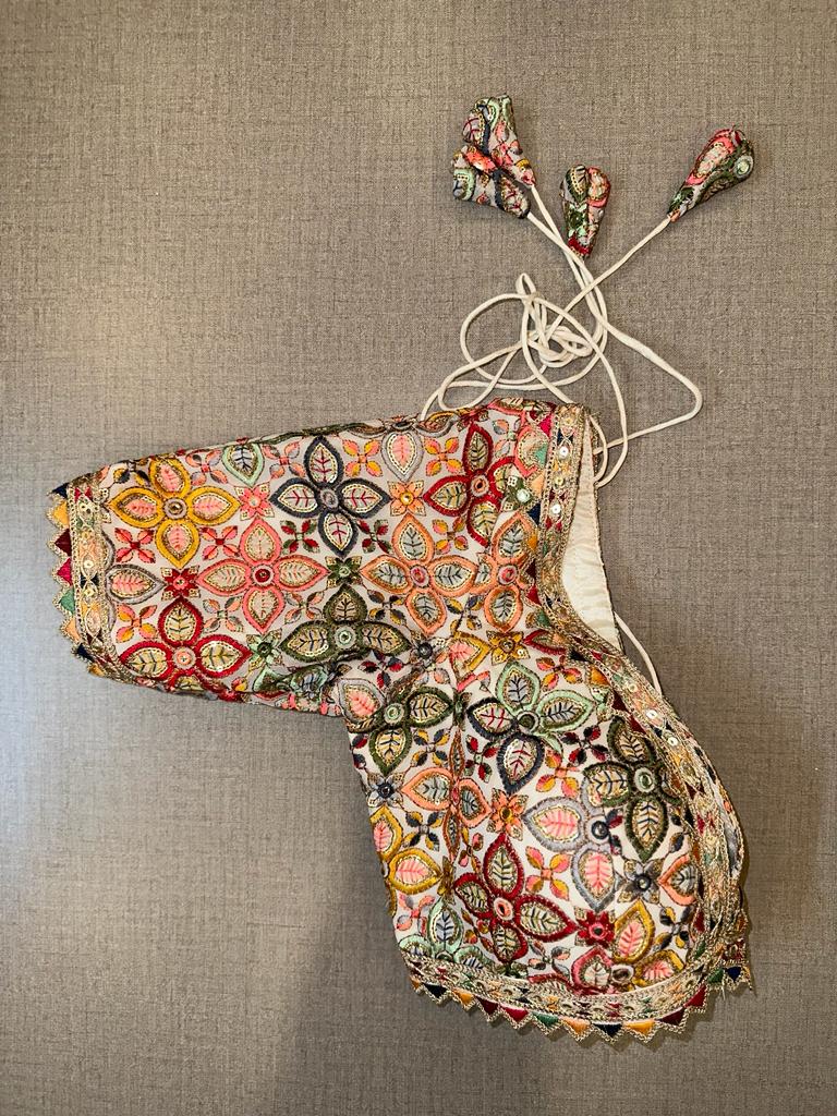 Classic is never old and enough to have in your closet!! This blouse compliments a beautiful multicolor floral embroidery, mirror work, 3/4th sleeves, V neck, hooks closure & tie-up at the back. Pair this fashionable off-white blouse with beautiful statement earrings and you are good to go! Buy this designer blouse in the USA from Pure Elegance.