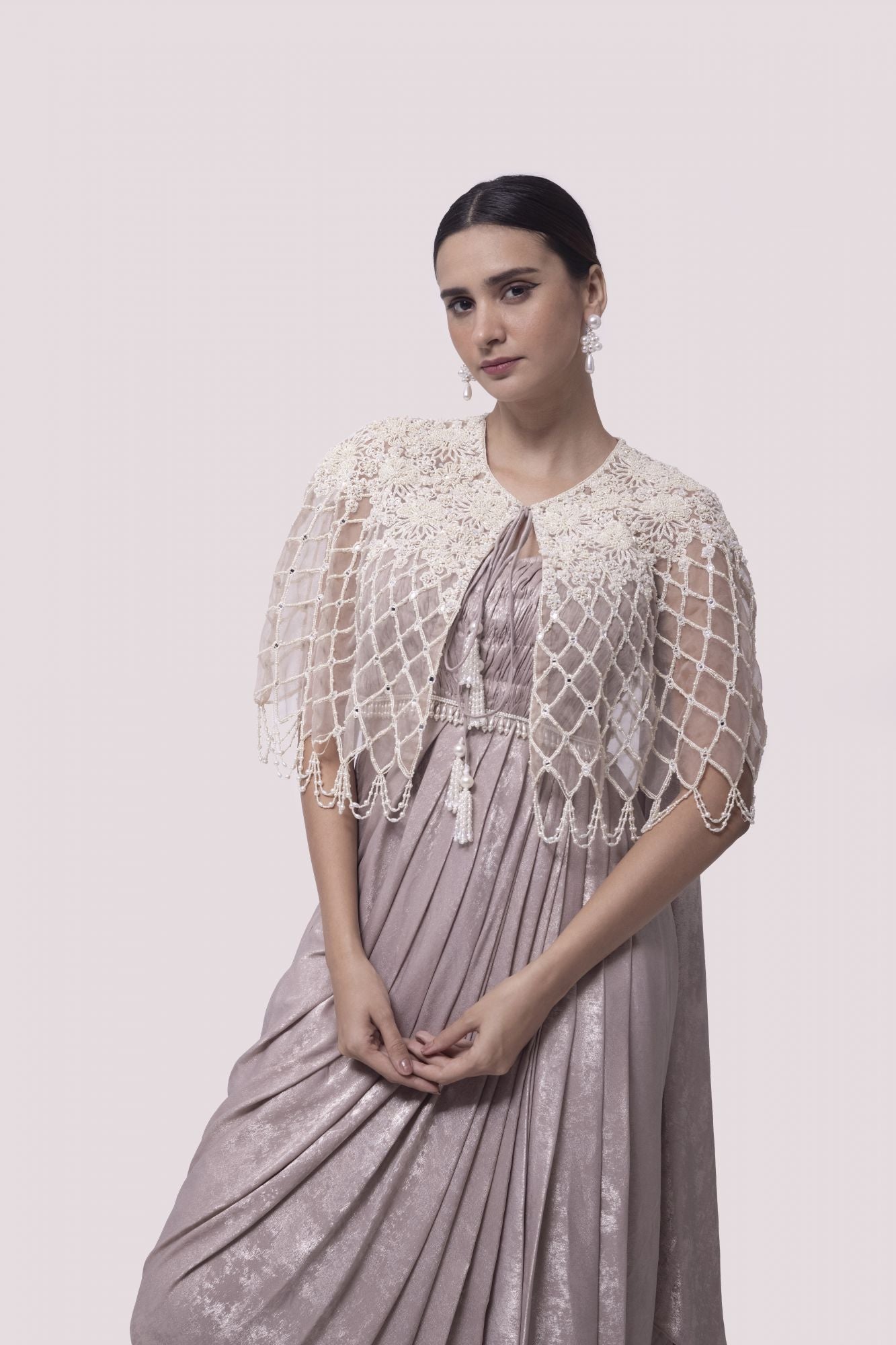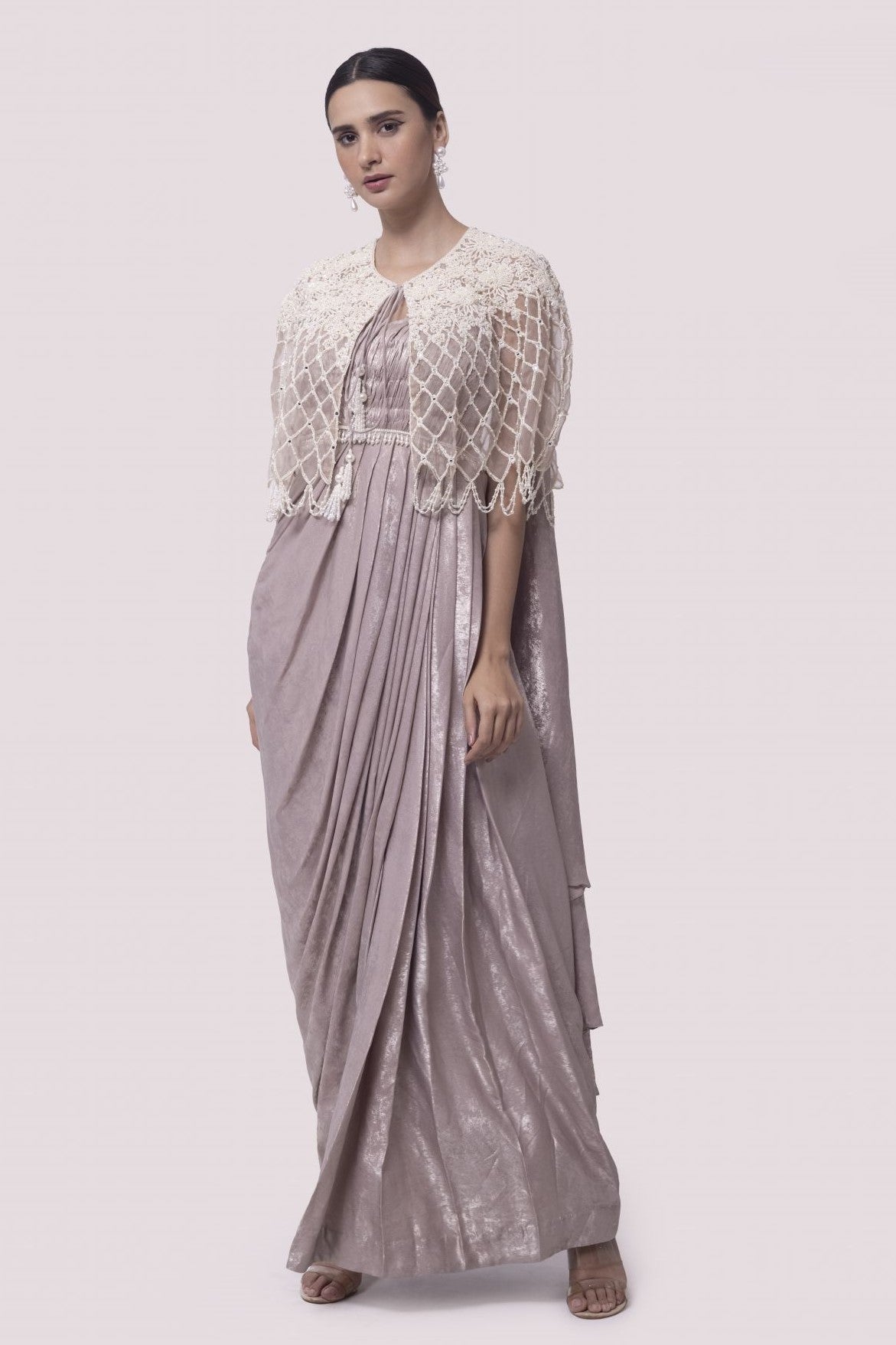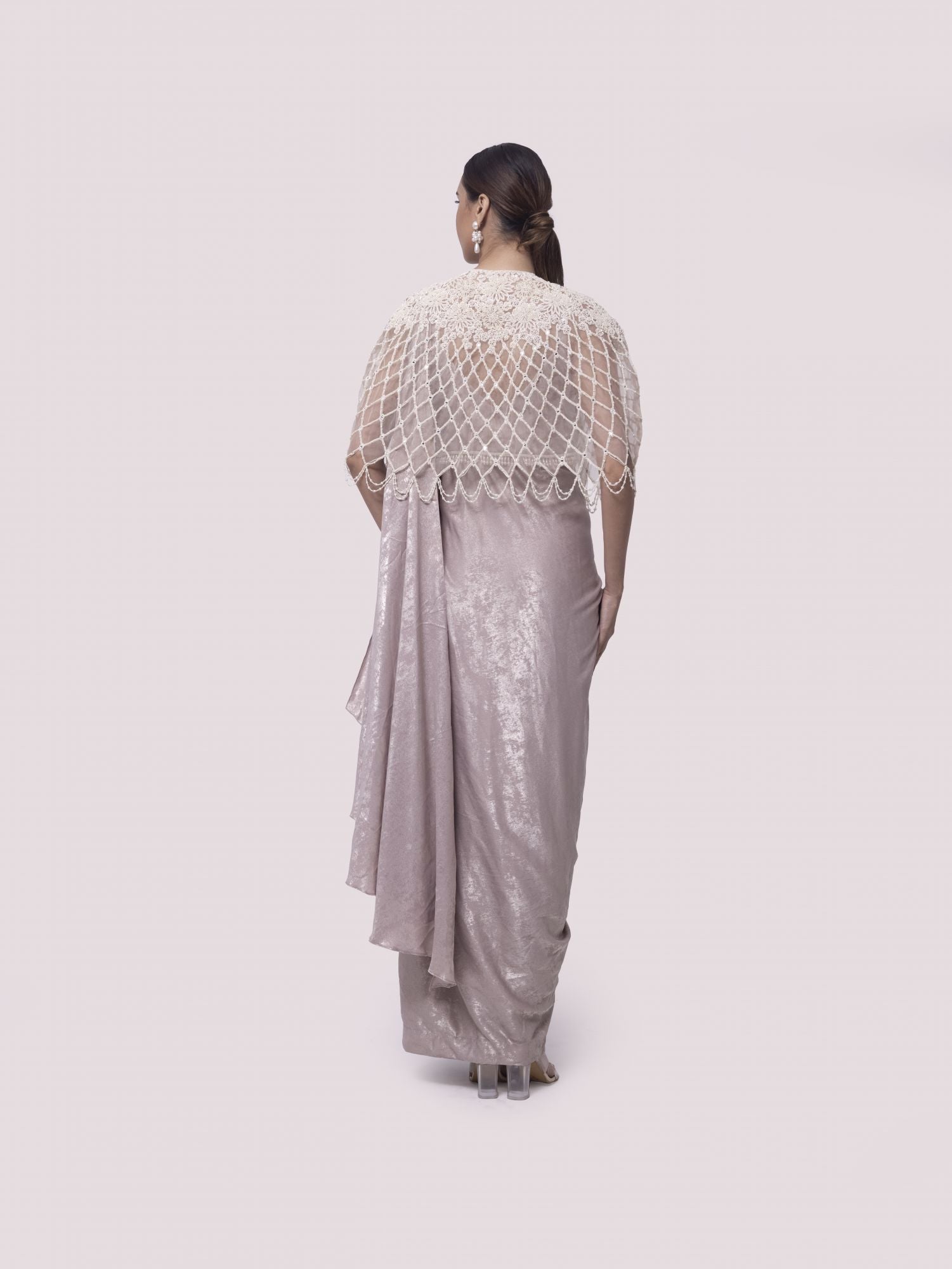 Shimmer lycra onion pink drape saree set featuring pearl embroidered sleeveless blouse, poncho, and embroidered belt detailings. Shop designer saris online in the USA from Pure Elegance.