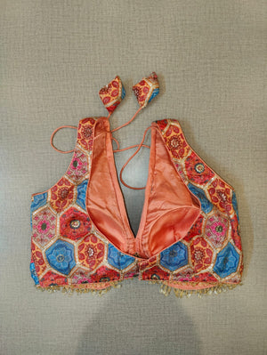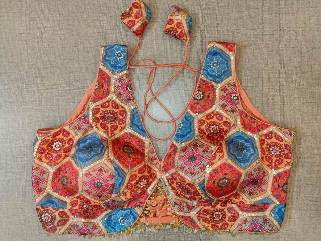 The orange multicolor block printed padded saree blouse, has a V-neck, short sleeves, tie-up detail at the back, hook, and eye closure. Let your aura shine throughout by wearing this designer saree blouse. Pair this fashionable blouse with a beautiful printed sari and statement neck piece and you are good to go. Buy this designer blouse in the USA from Pure Elegance.