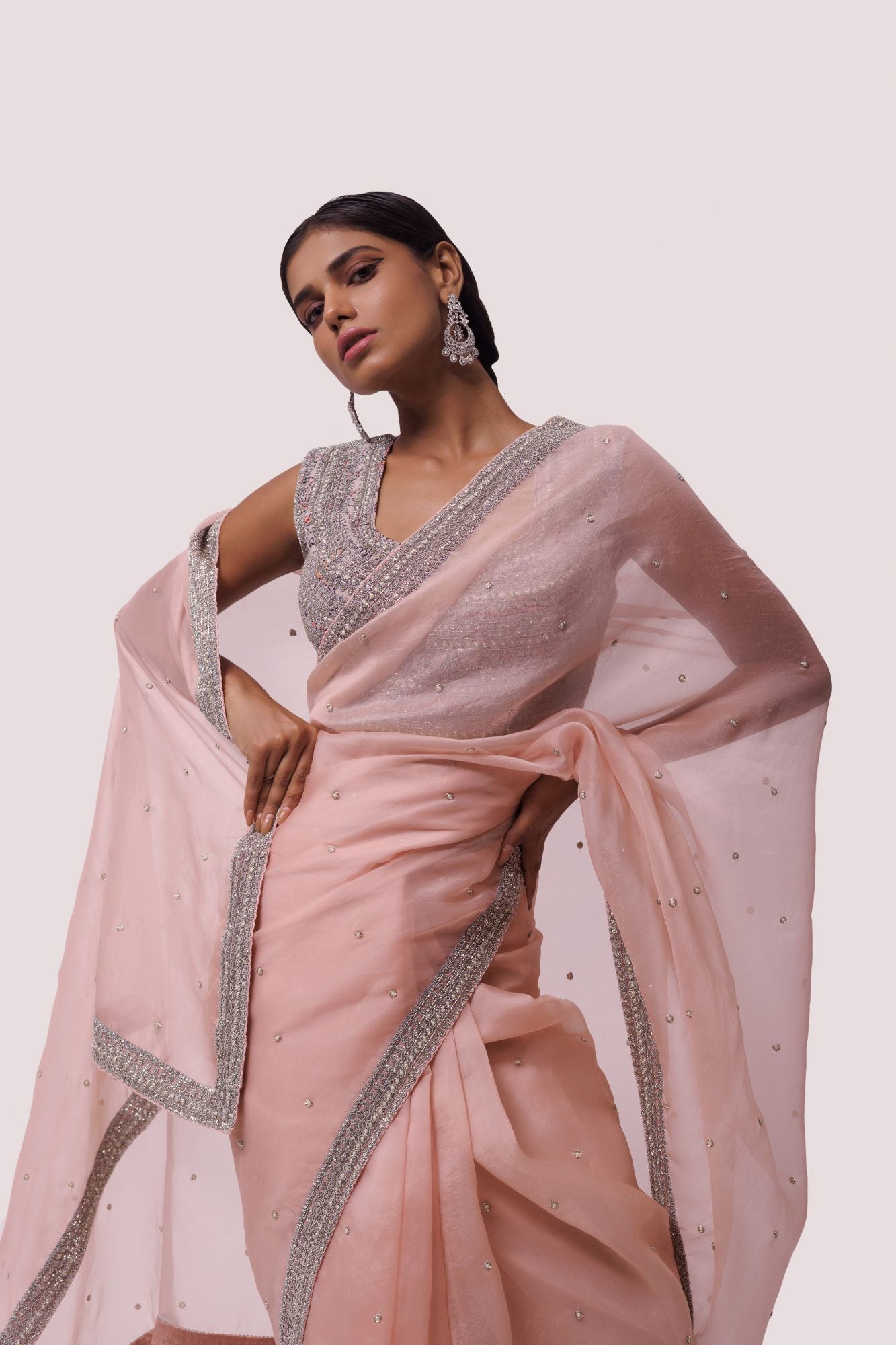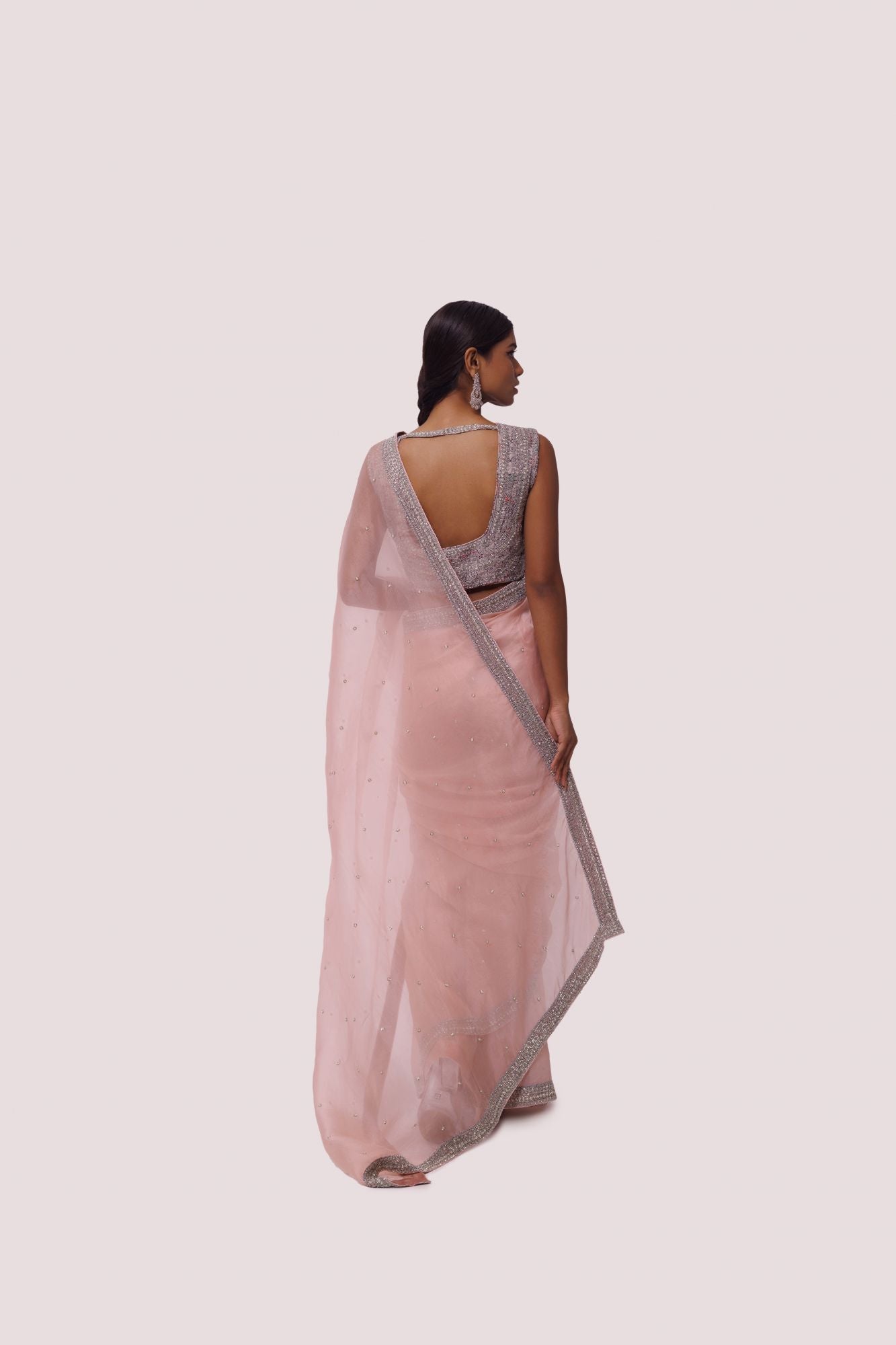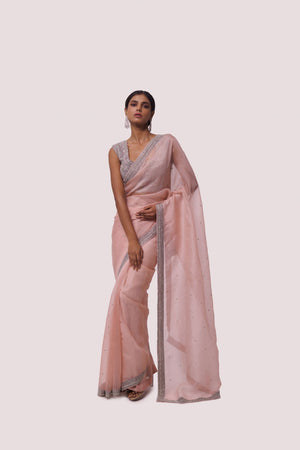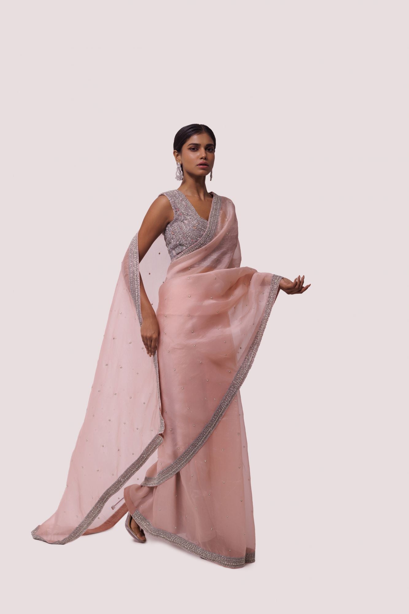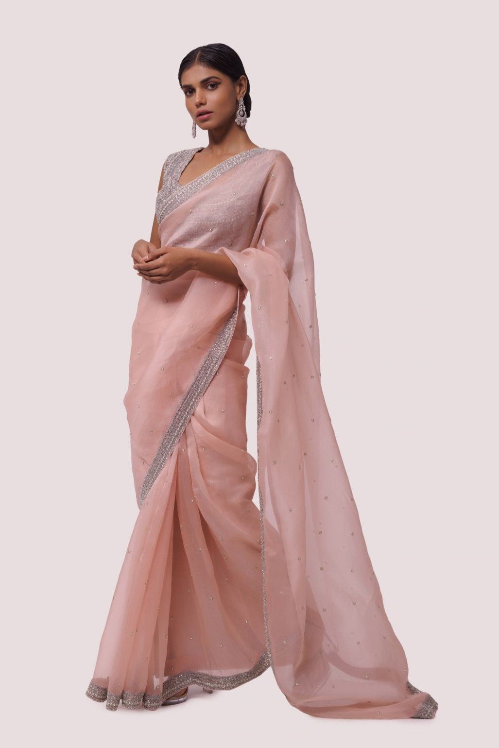 Beautiful organza saree with embellishments featuring cut dana work. Comes with cap sleeves & heavy embroidered blouse. Shop designer saris online in the USA from Pure Elegance.