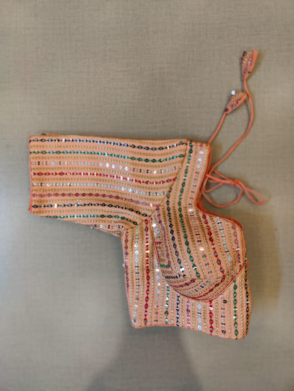 The peach multicolor sequinned saree blouse, has a U-neck, short sleeves, a hook, and a tie-up closure at the back. Drape a saree over this pretty blouse and be the start of any function. You can also style it with a palazzo to create a fusion outfit. Buy this designer blouse in the USA from Pure Elegance.