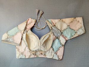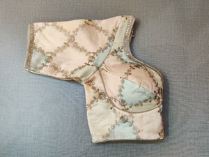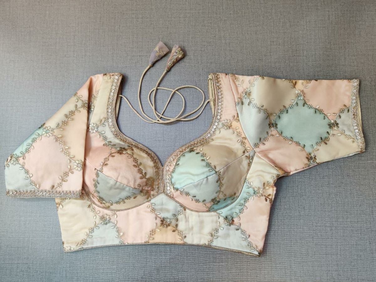 Classic is never old and enough to have in your closet!! Pair this fashionable lavender blouse with beautiful floral embroidery, pair this with a beautiful sari and statement neck piece and you are good to go! It has a beautiful U shape neck in front & back, short sleeves, hook closure, and a tie-up at back. Buy this designer blouse in the USA from Pure Elegance.