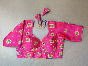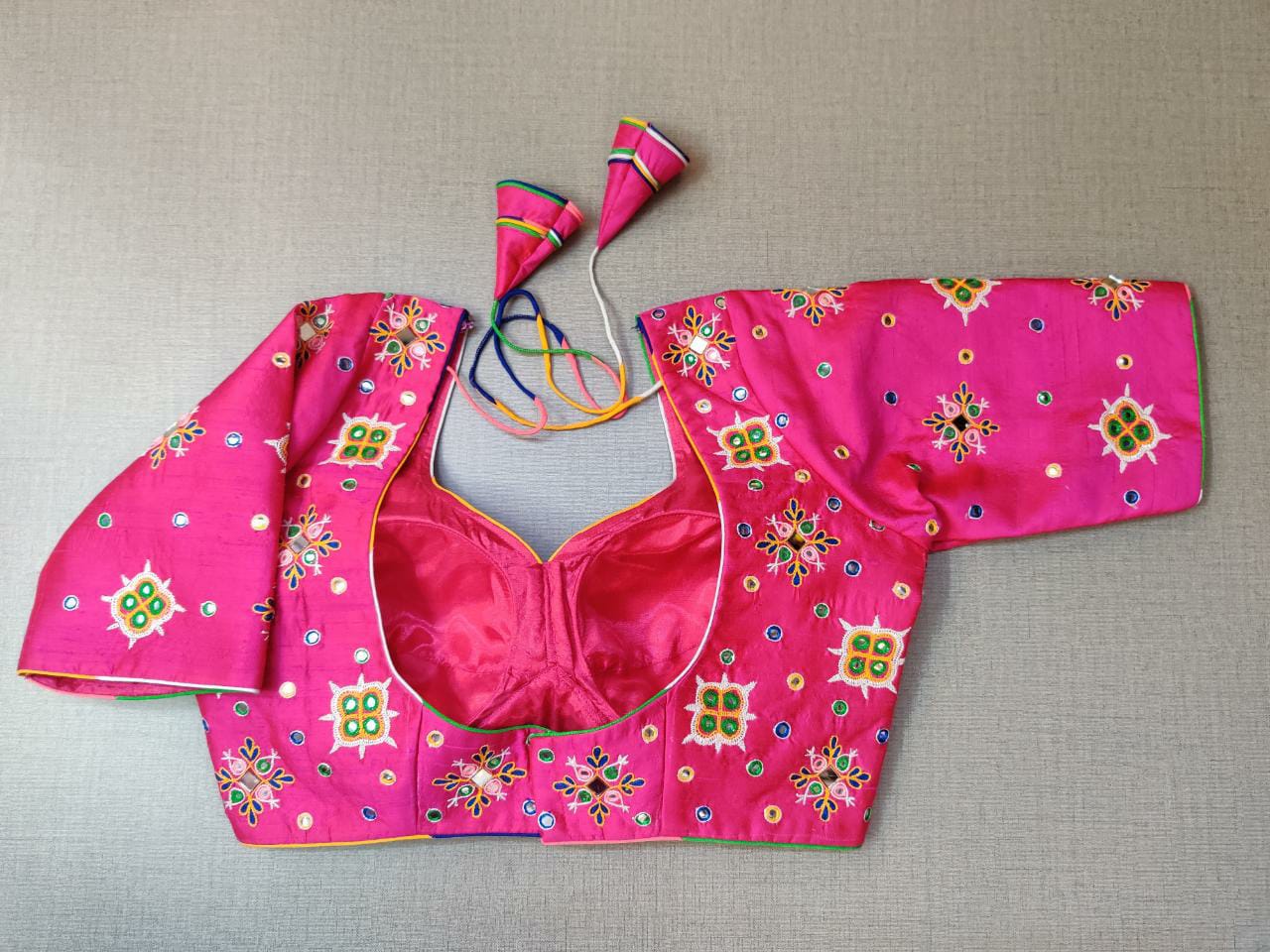 Brighten up your festive look with this enchanting pink mirrorwork embroidered blouse. Features beautiful thread work with small mirrors on the blouse, U shape front & back, hook closure, and tie-up. This blouse can elevate the simplest of outfits. Buy this designer blouse in the USA from Pure Elegance.