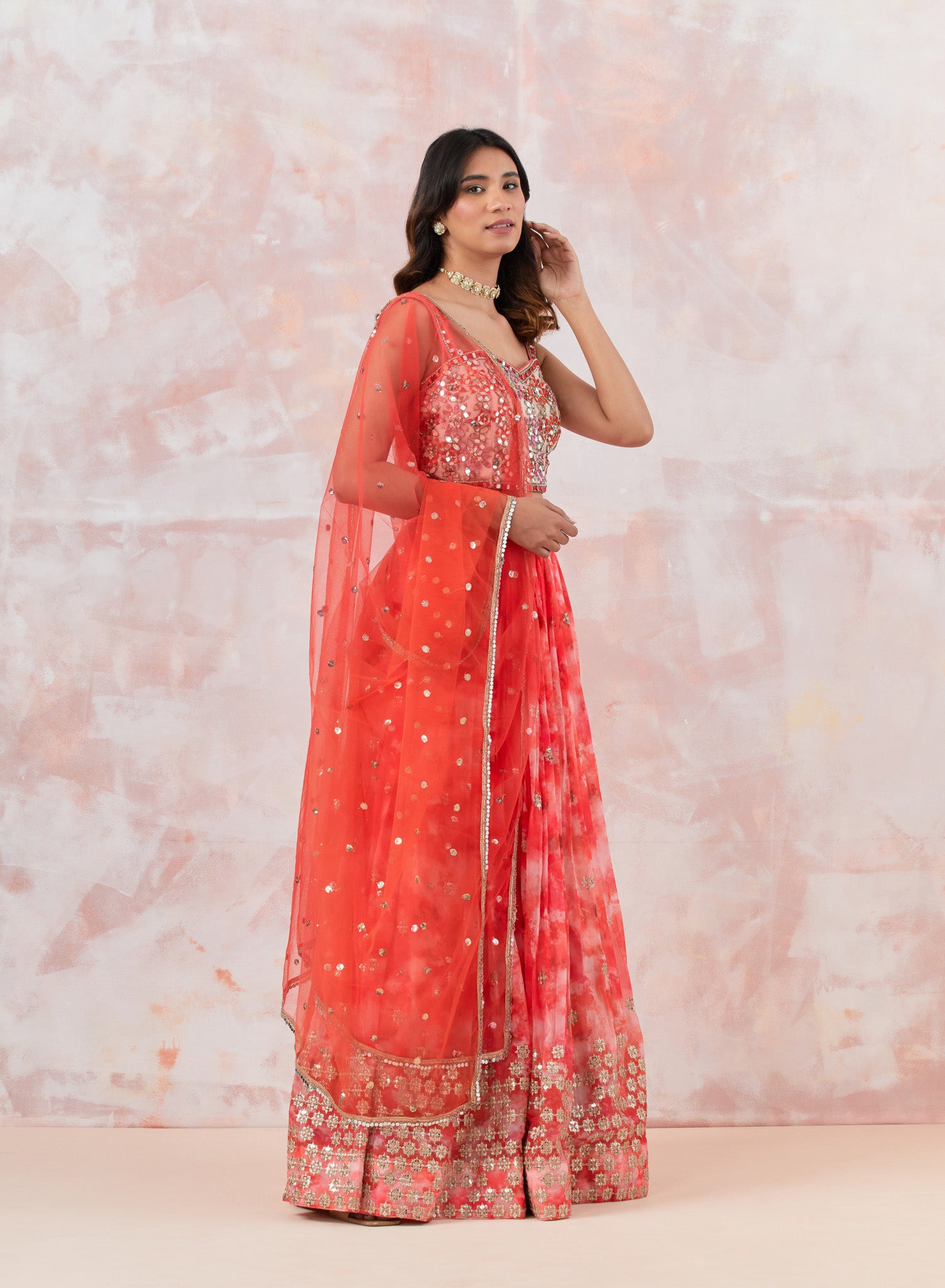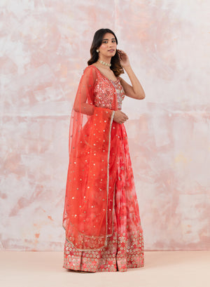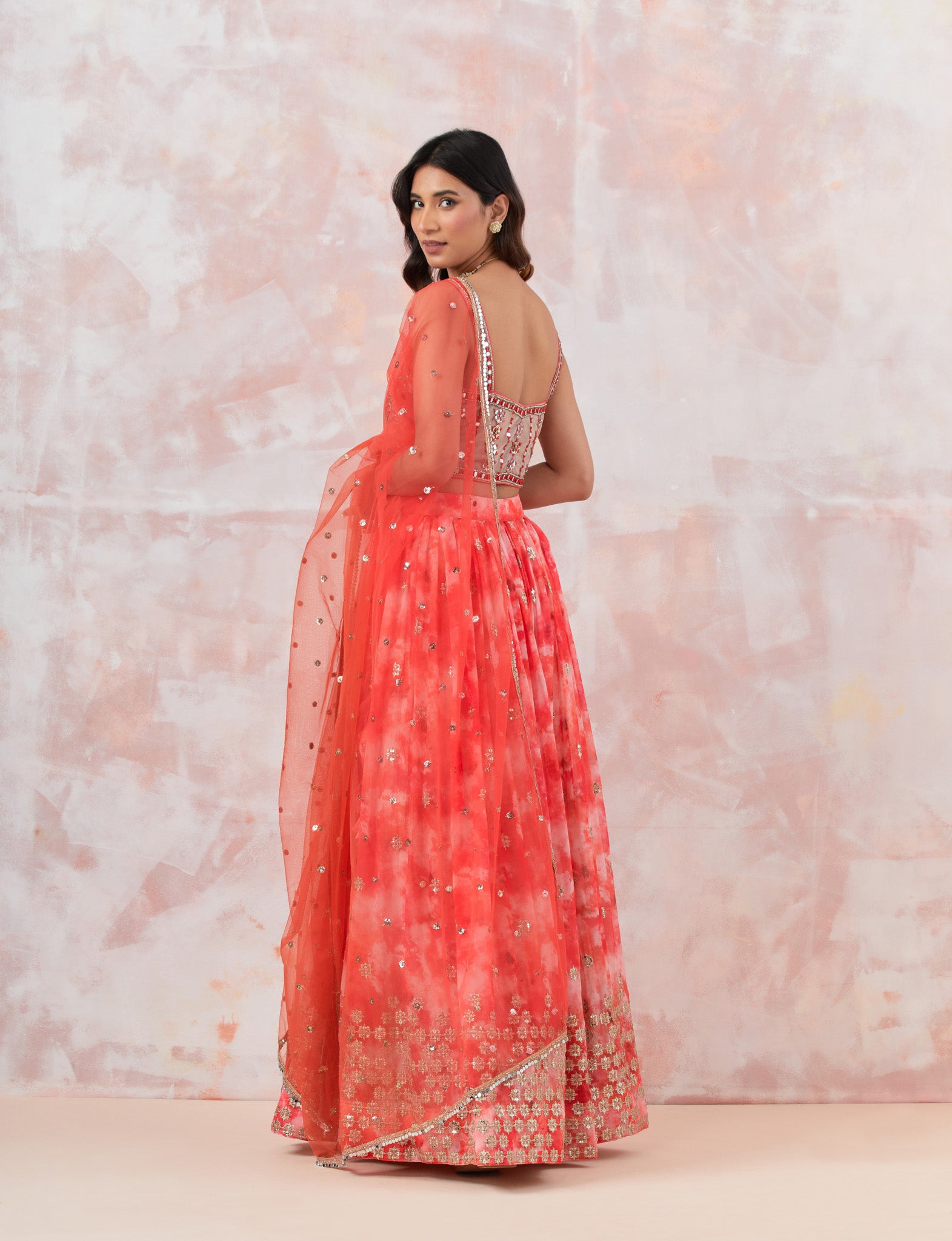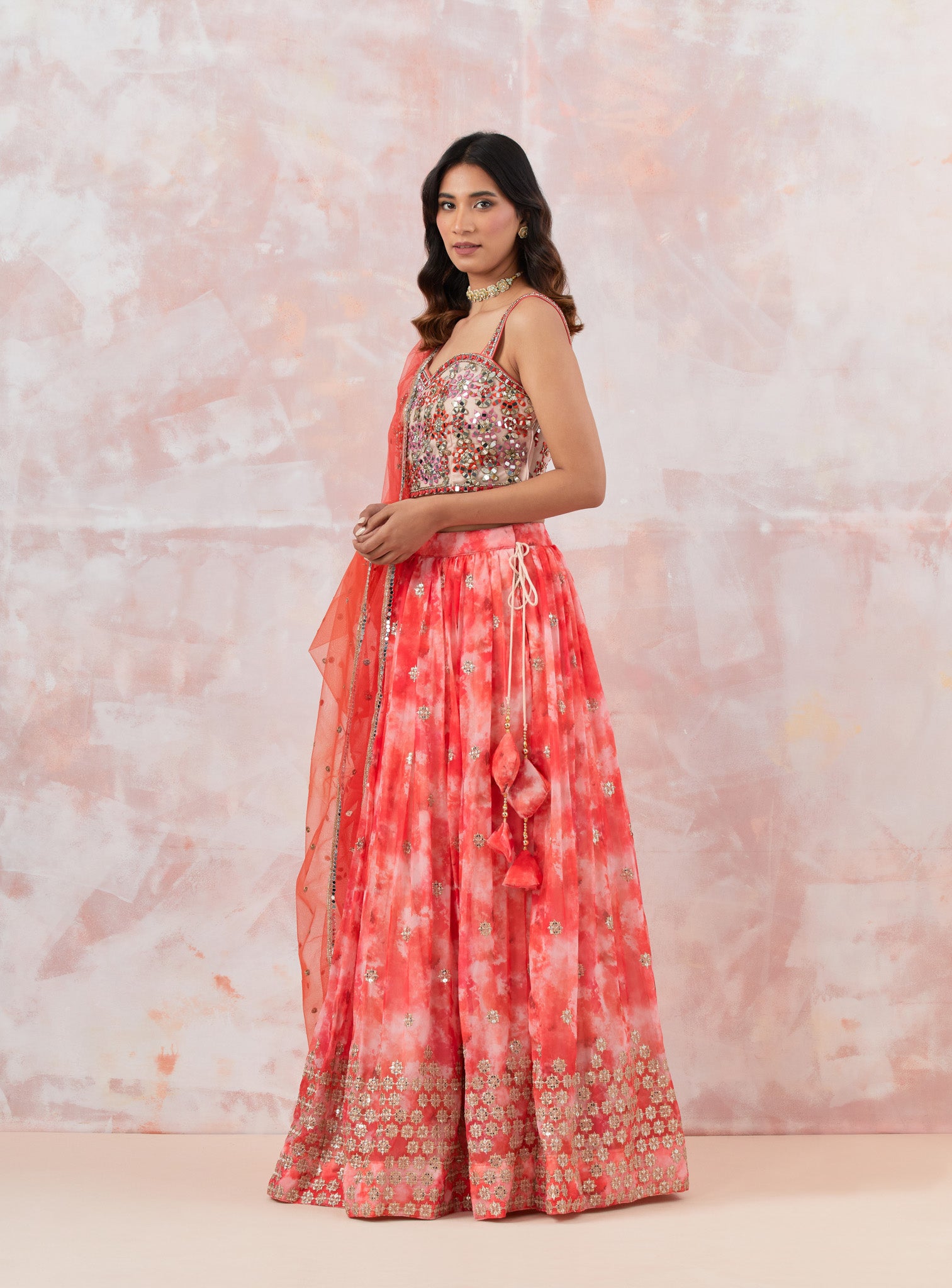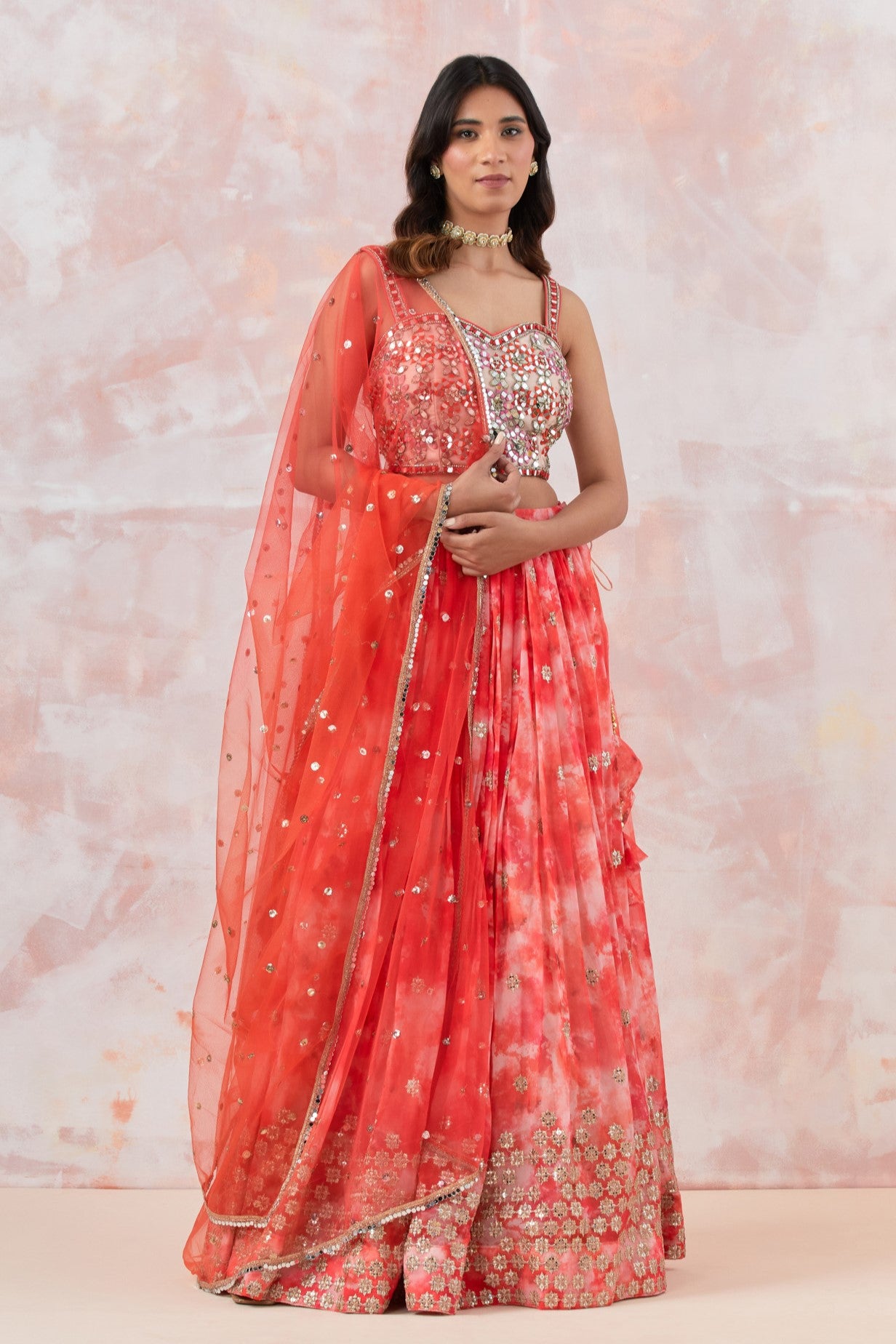 Look your best on wedding occasions in this pink tie-dye lehenga with mirror work, strappy blouse & soft net embroidered dupatta. Dazzle on special occasions with exquisite Indian designer dresses, sharara suits, Anarkali suits, bridal lehengas, and sharara suits from Pure Elegance Indian clothing store in the USA. Shop online from Pure Elegance.