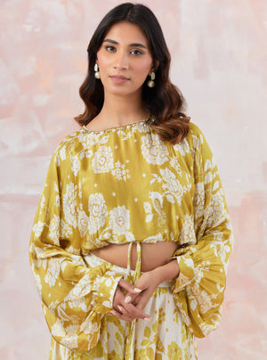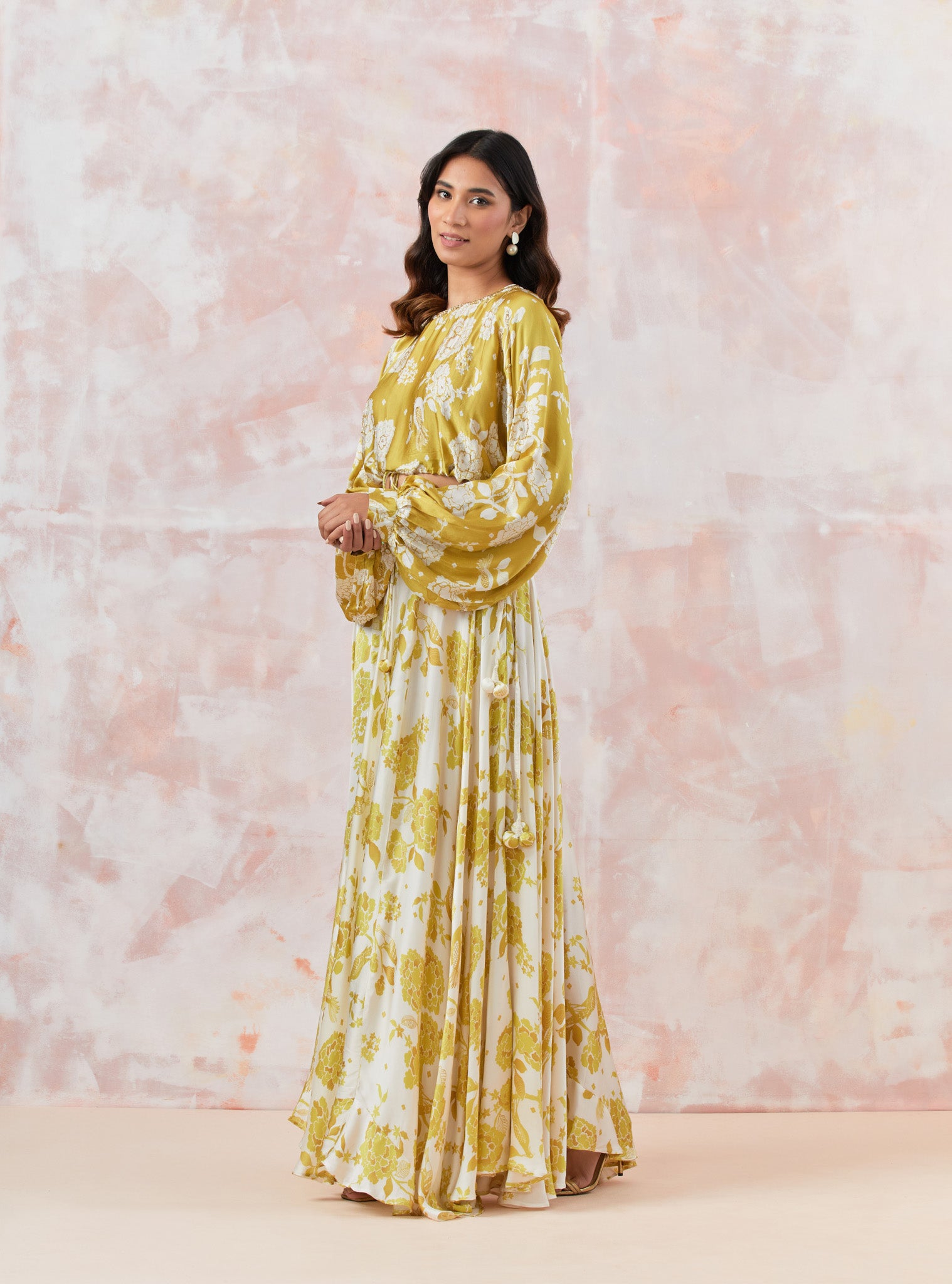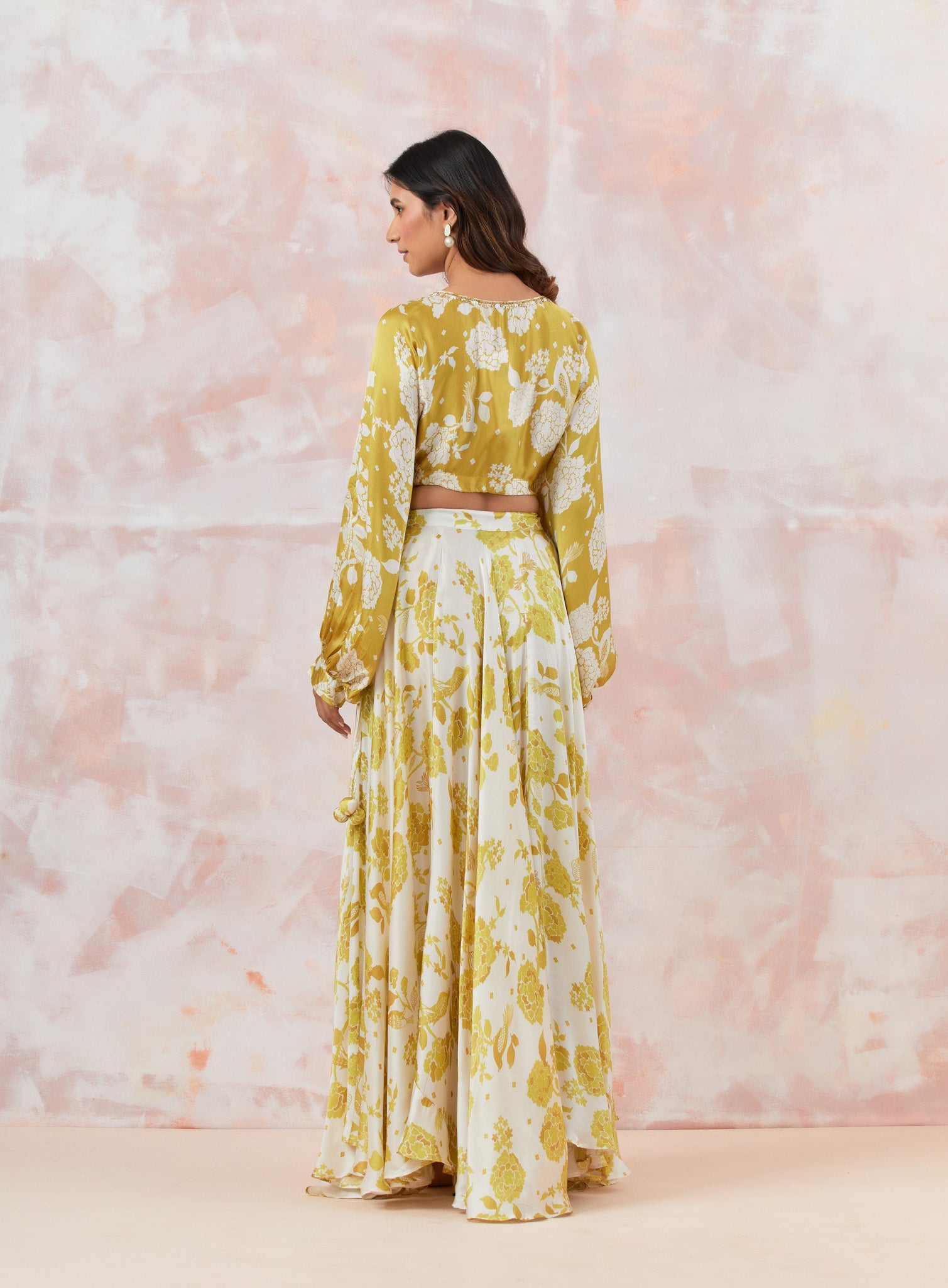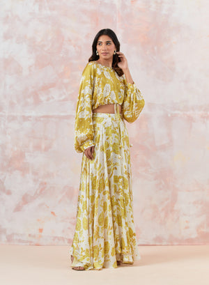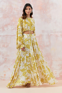 Pista green stylish floral skirt set features stunning floral motifs and cheenta handwork. Shop online from Pure Elegance.