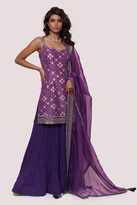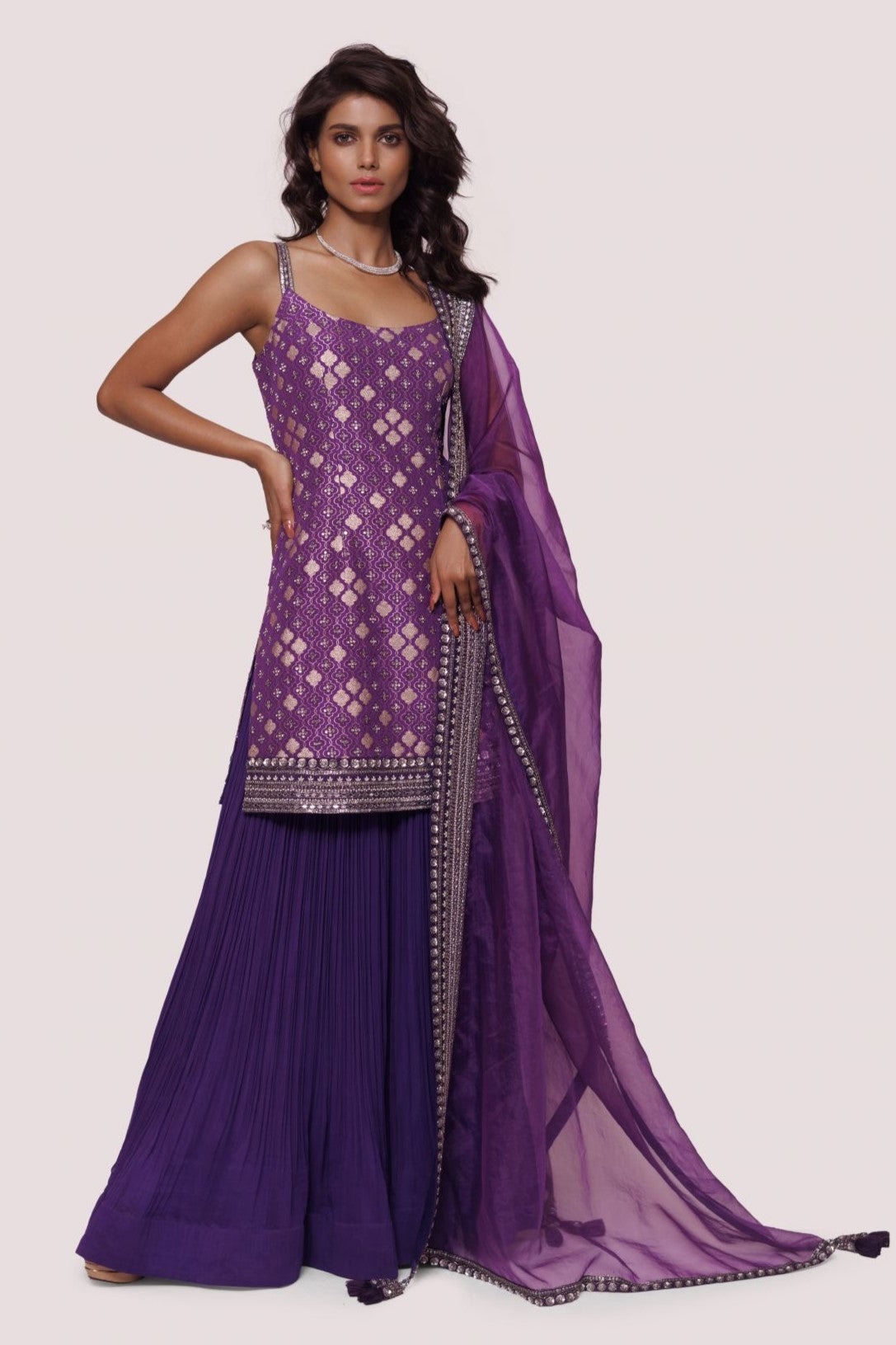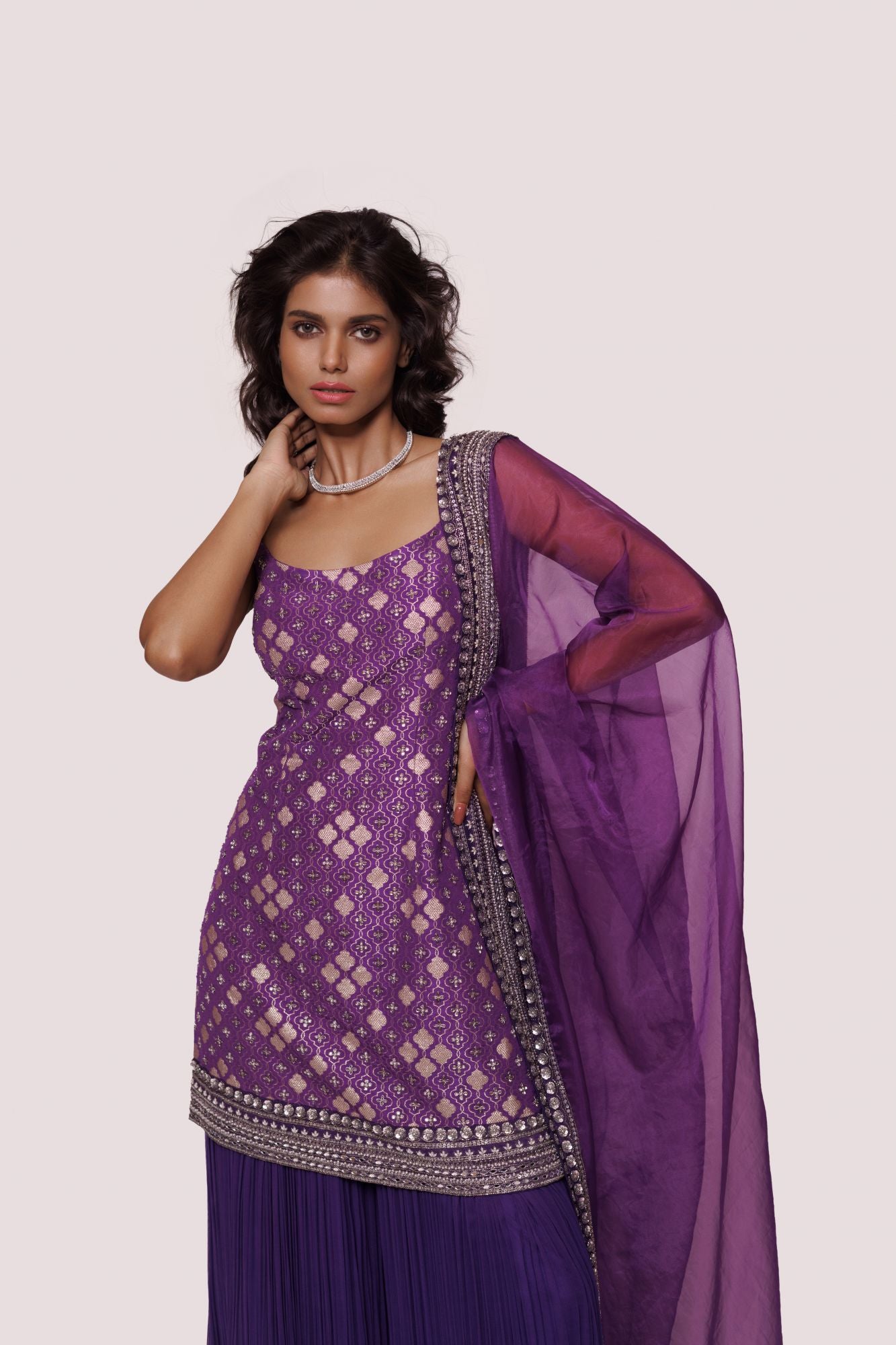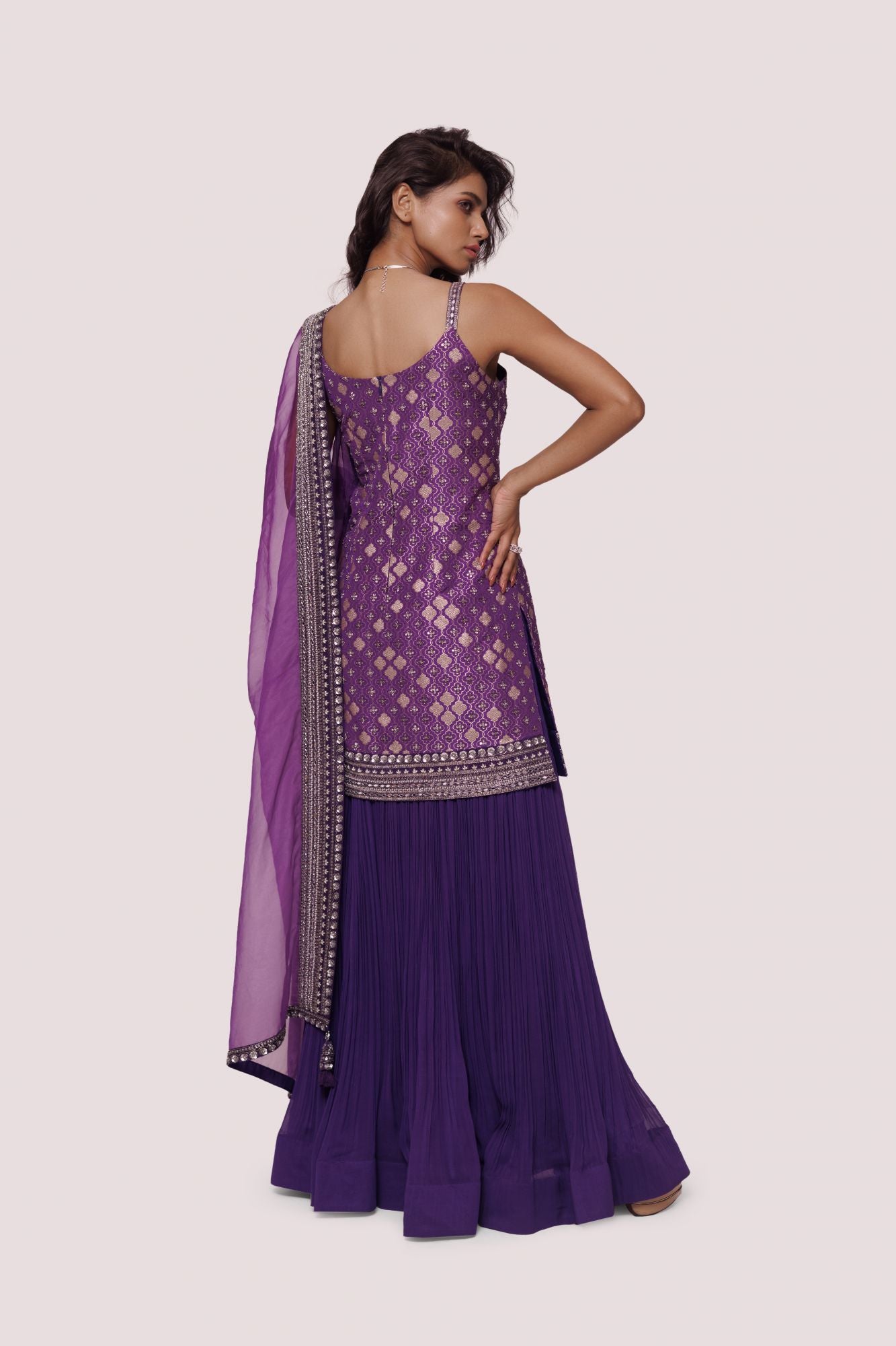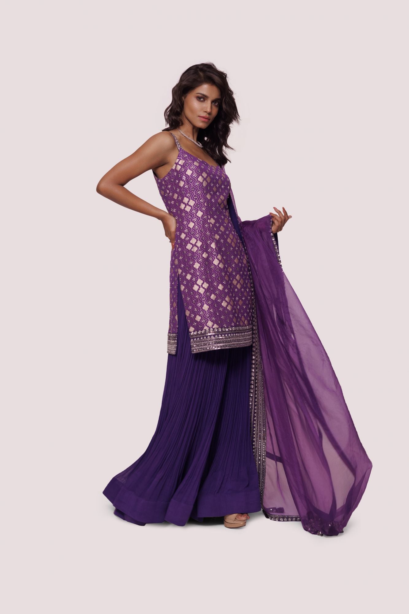 Purple suit set with printed brocade top with embellished narrow strap sleeves and hemline. Paired with georgette Sharara pants. Come with a Dupatta embellished along the edges. It also includes a mirror, sequins, beads, and Dabka work. Shop online from Pure Elegance.