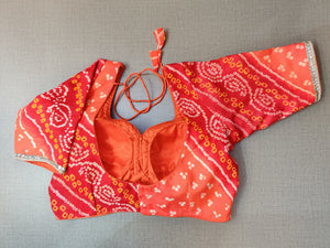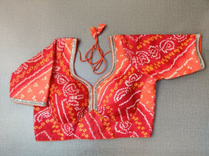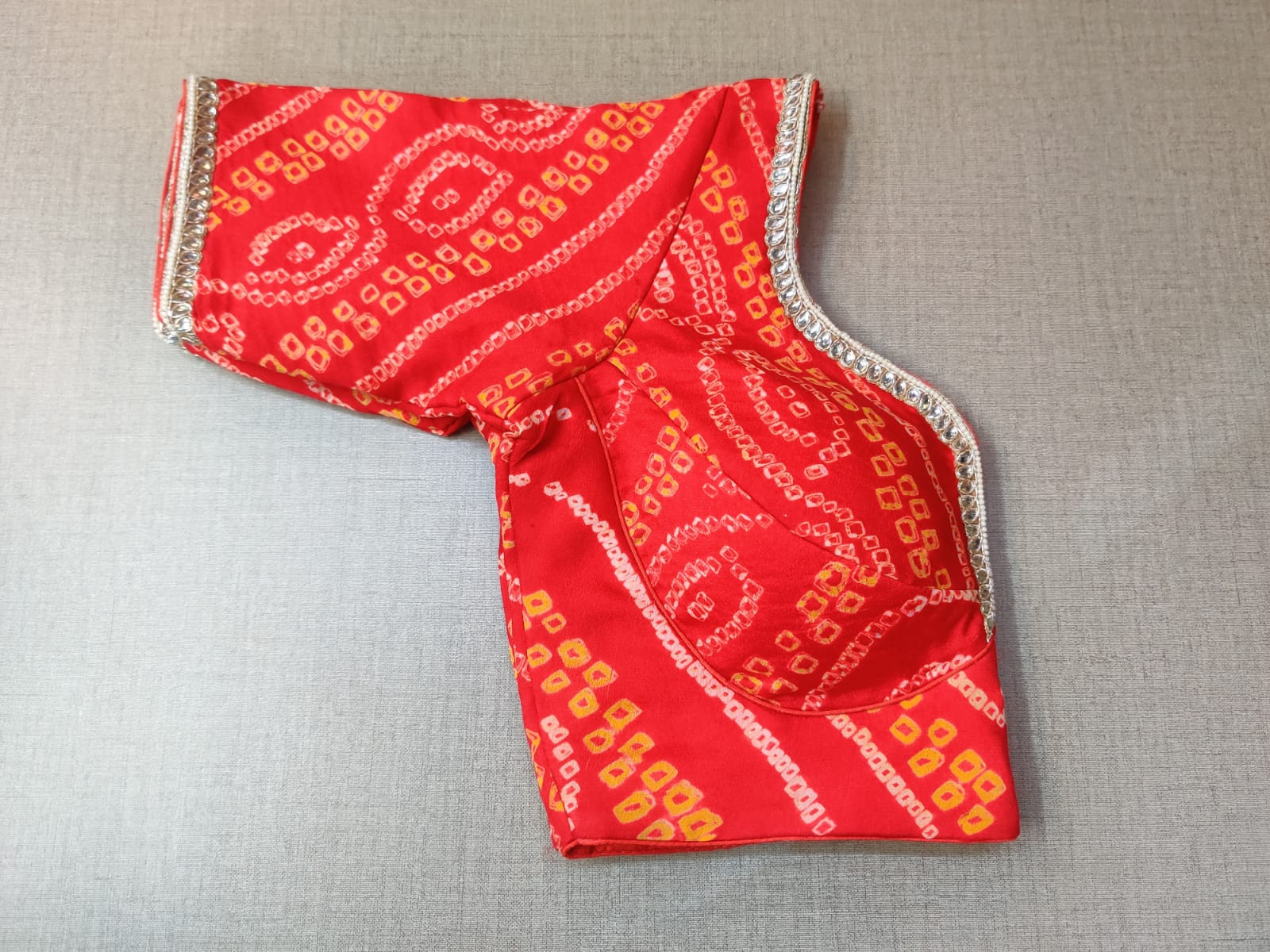 Beautiful red color Indian saree designer blouse with bhandej pattern. You can pair up with any Indian Saree for any Indian festival occasion to make your look elegant. This red blouse is a woven design padded saree blouse that has a beautiful neck, a U shape back, and hook closure. Buy this designer blouse in the USA from Pure Elegance.