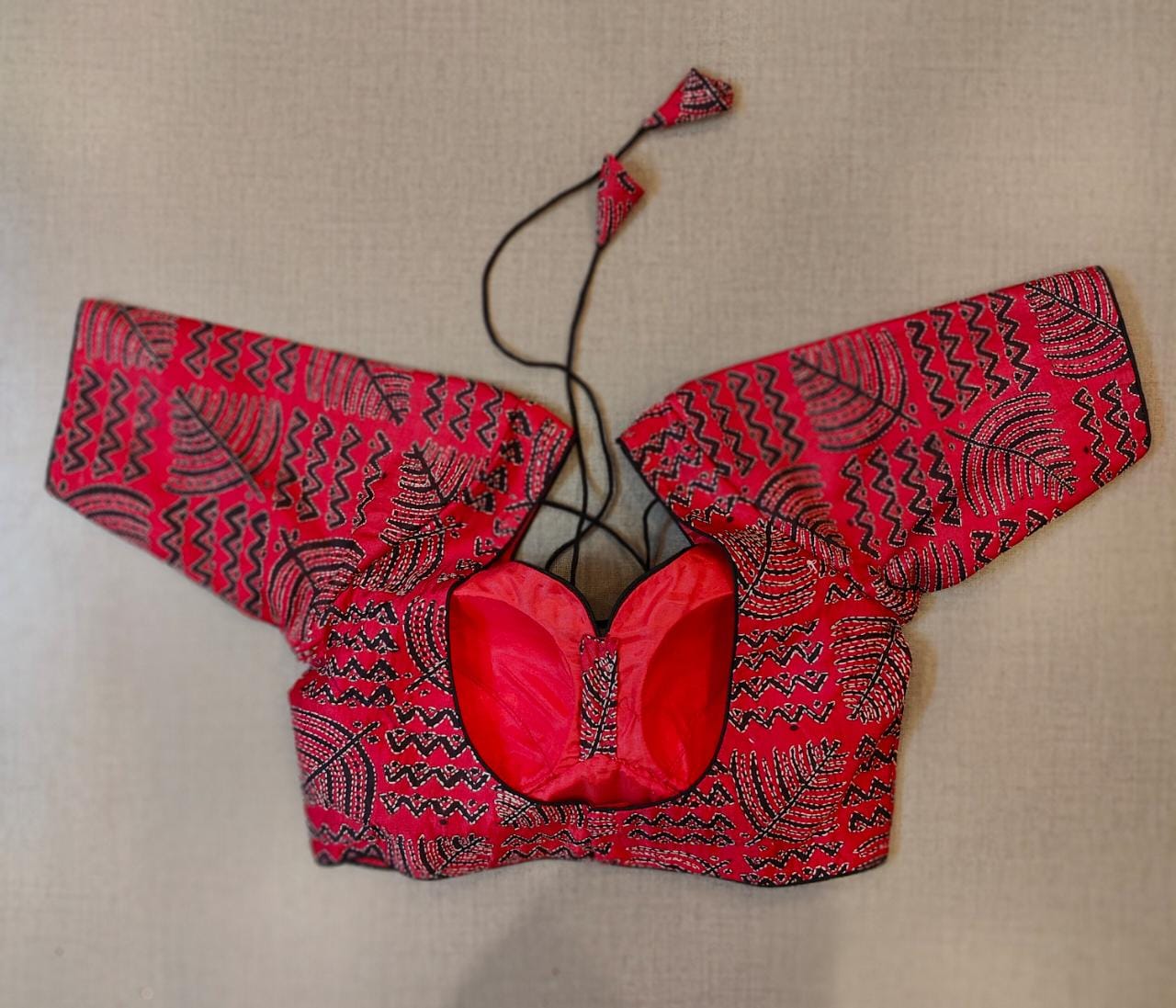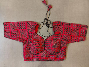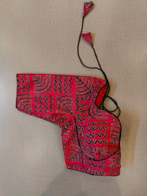 Women's red-black printed, padded Saree Blouse, has a round neck, Hook & tie-up closure at back with 3/4th sleeves. Classic is never old and enough to have in your closet!! Pair this fashionable blouse with a beautifully printed sari and statement neckpiece and you are good to go! Buy this designer blouse in the USA from Pure Elegance.
