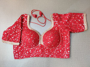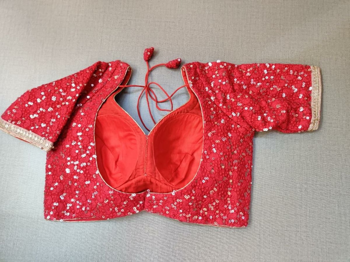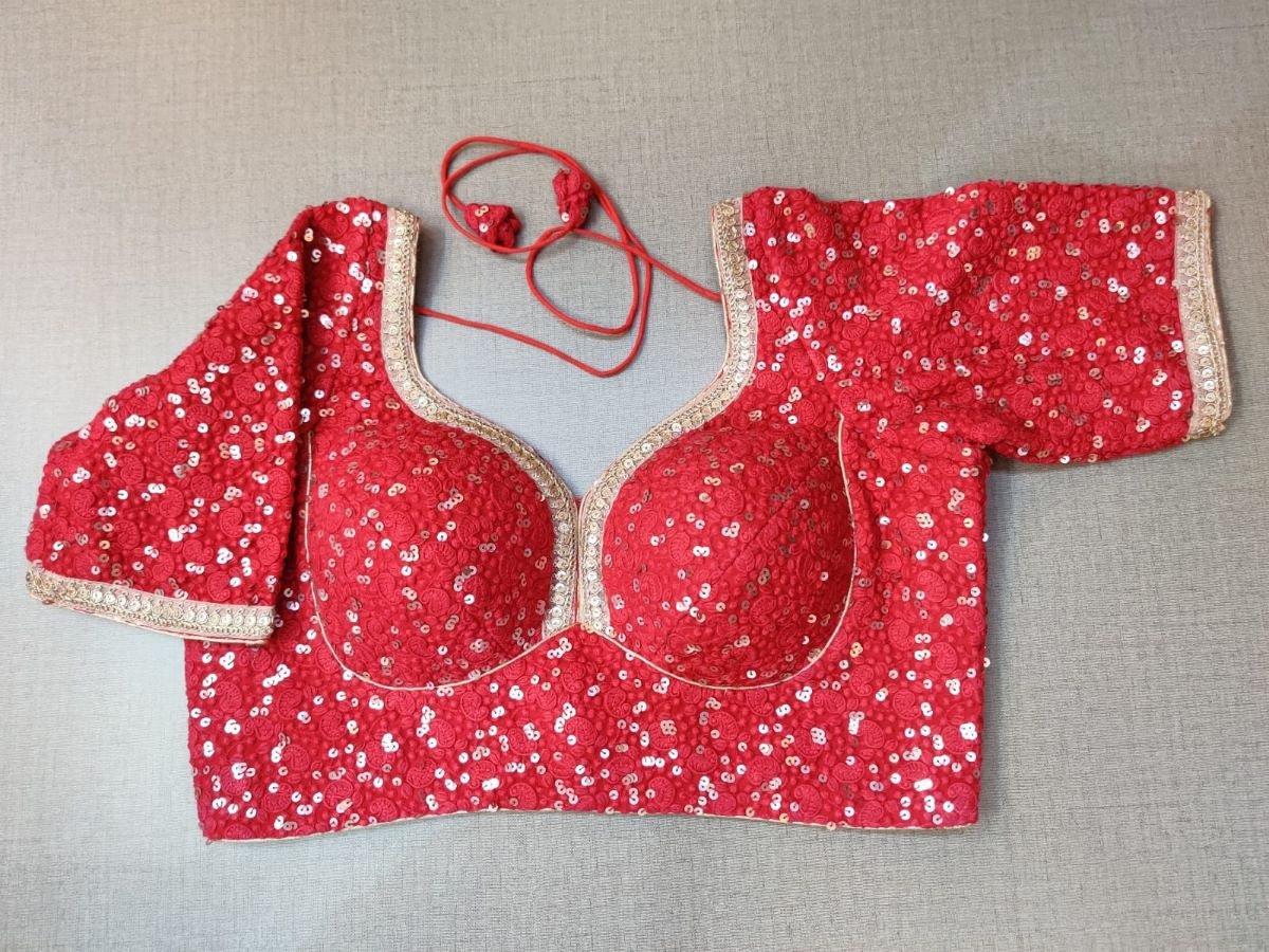 Classic is never old and enough to have in your closet!! Pair this fashionable red blouse with beautiful sequin embroidery. Pair it with a silk sari and statement earrings and you are good to go! This is a perfect blouse for festivals and wedding occasions. Buy this designer blouse in the USA from Pure Elegance.