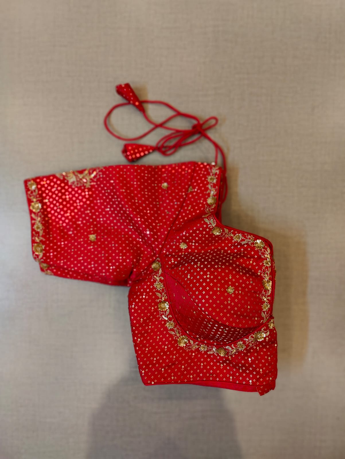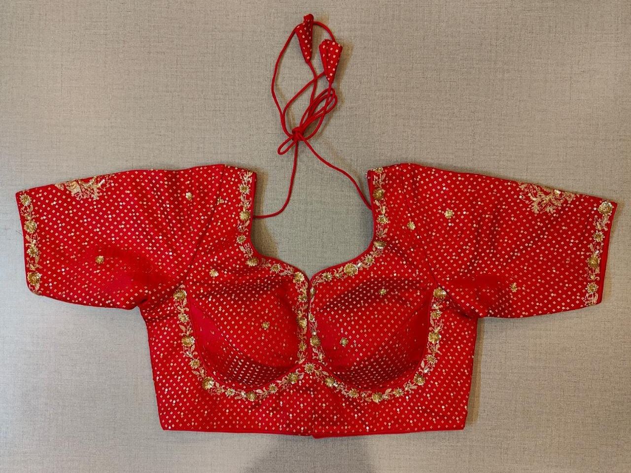 This blouse is a rich add-on to glam up your look. The blouse features a block printed, a 3/4th blouse, and a tie-up closure at back. Team this blouse with a lovely solid saree to look gorgeous and create a stunning and beautiful look. Buy this designer blouse in the USA from Pure Elegance.