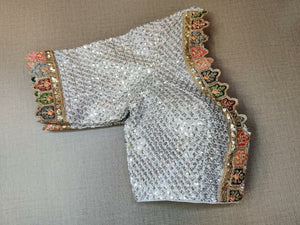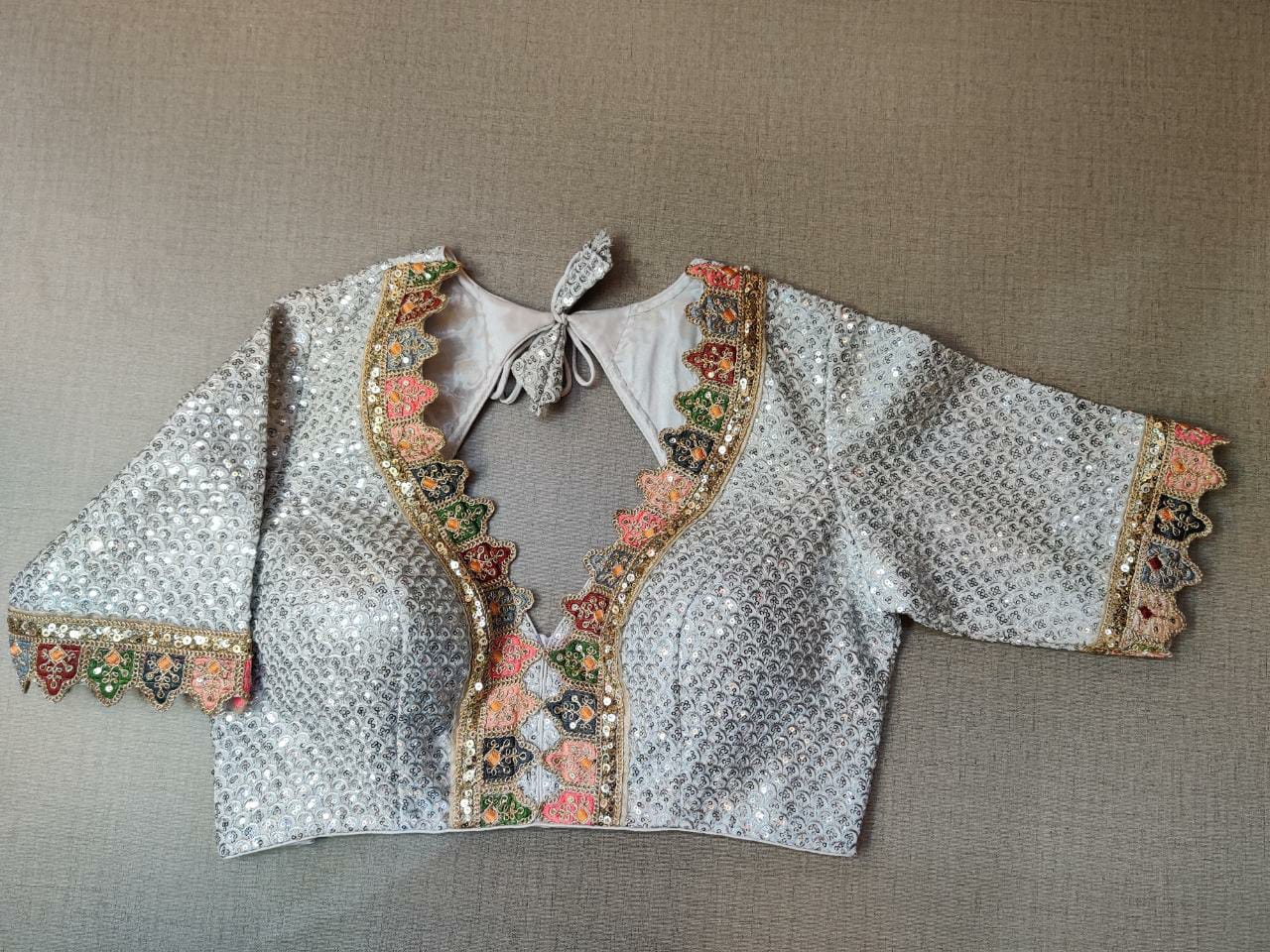 Silver blouse in silk and mesh with striking sequin embroidery. Tailored with short sleeves it features a beautiful U-neck, a beautiful thick multicolor border, a tie-up, and hook closure at the back. Pair this blouse with a beautiful Indian saree and statement neck piece and you are good to go! Buy this designer blouse in the USA from Pure Elegance.