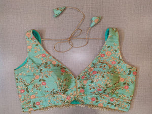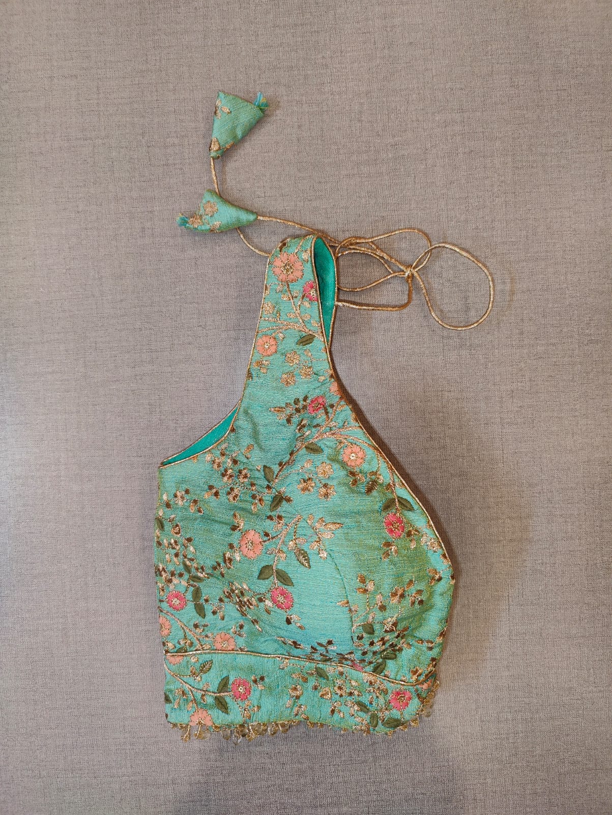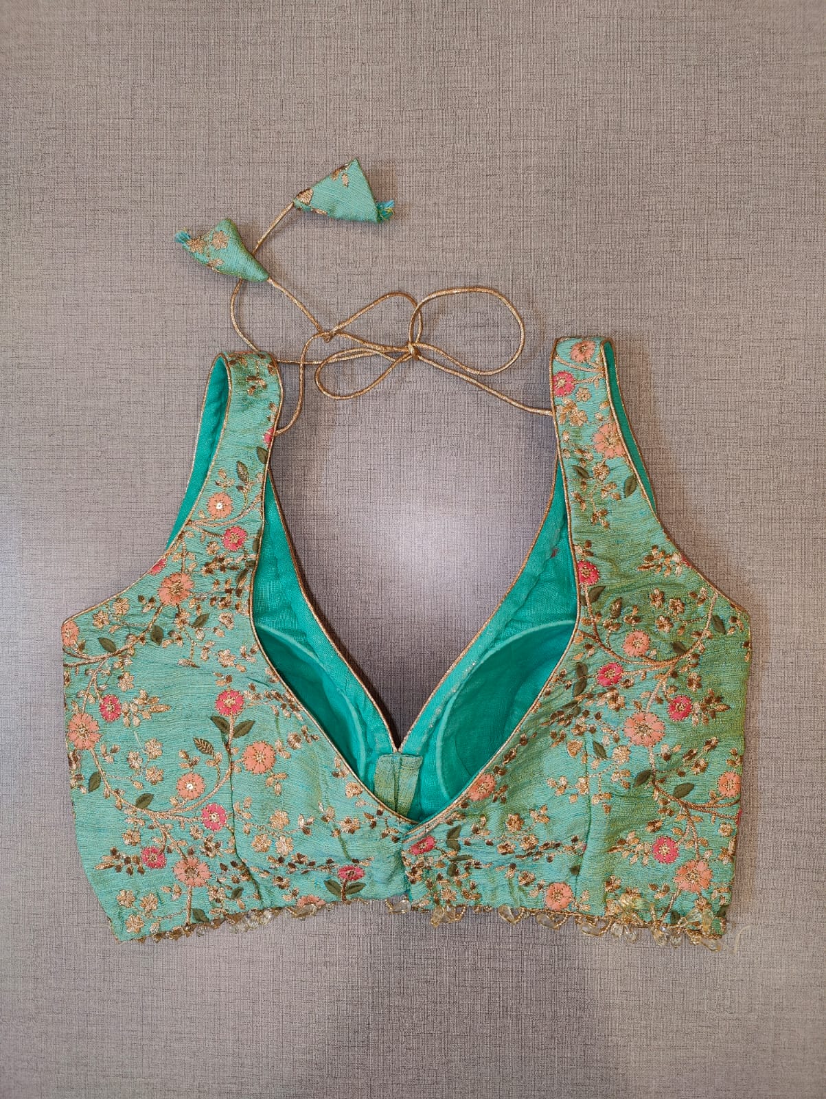 Give your ethnic look a dazzling update with this turquoise blouse. Tailored in silk, it features sleeveless, floral embroidery, a V-neck in the front, and hook closure at the back details. Pair it with a complementary solid sari and diamond stud earrings. Buy this designer blouse in the USA from Pure Elegance.