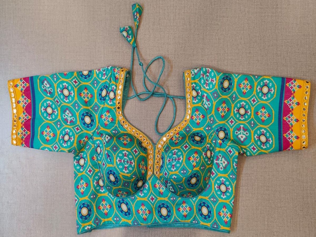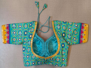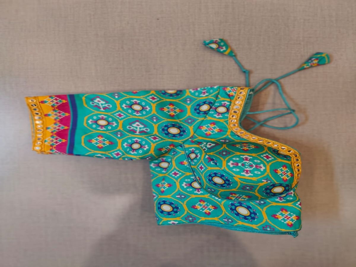 Minimal yet stylish, this turquoise blouse with Jaipuri print in different colors will brighten up your festive soirees. Featuring an embroidered mirror work border at the front & back, the blouse is U-neck in front and U shape in the back, 3/4th sleeves, hook closure, and tie-up at back. Buy this designer blouse in the USA from Pure Elegance.