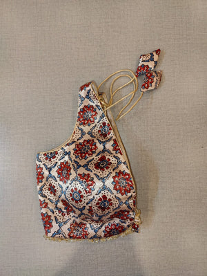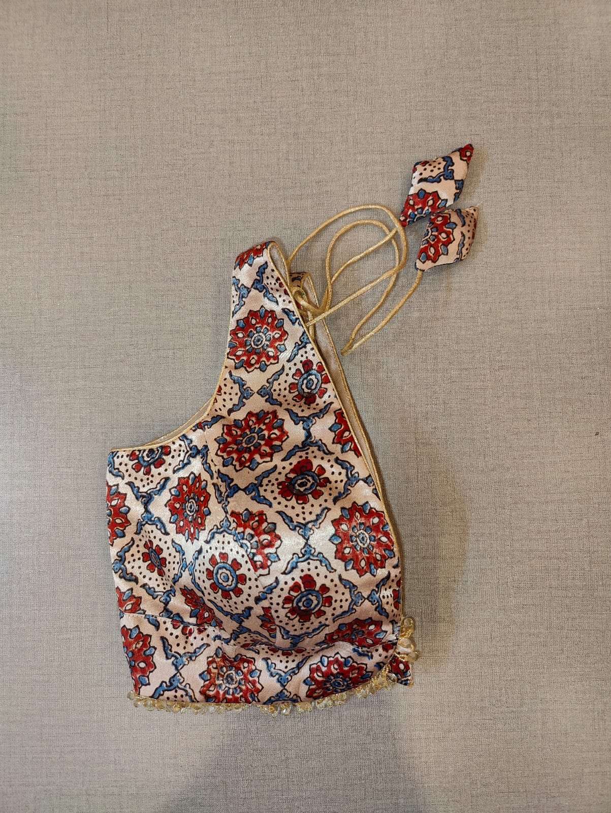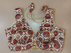 The white block printed padded saree blouse, has a V-neck, short sleeves, tie-up detail at the back, hook, and eye closure. Let your aura shine throughout by wearing this designer saree blouse. Pair this fashionable blouse with a beautiful printed sari and statement neck piece and you are good to go. Buy this designer blouse in the USA from Pure Elegance.