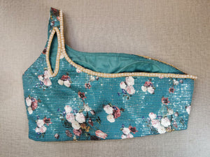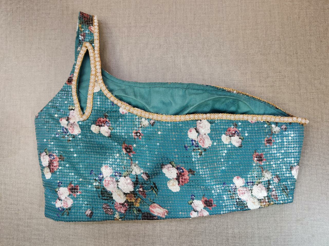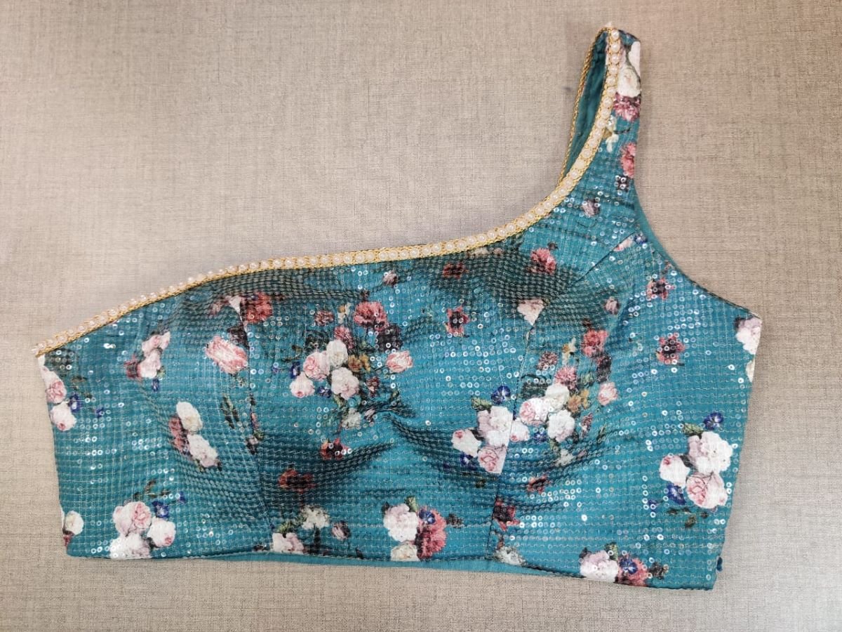 Blue blouse crafted with beautiful sequin embroidery and floral print. Tailored with one-sided strappy shoulders, the blouse features a smocked back for comfort and style, and hook closure. Give your ethnic look a dazzling update with this blue blouse. Pair it with a beautiful silk saree to have a perfect party look. Buy this designer blouse in the USA from Pure Elegance.