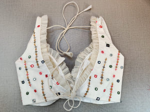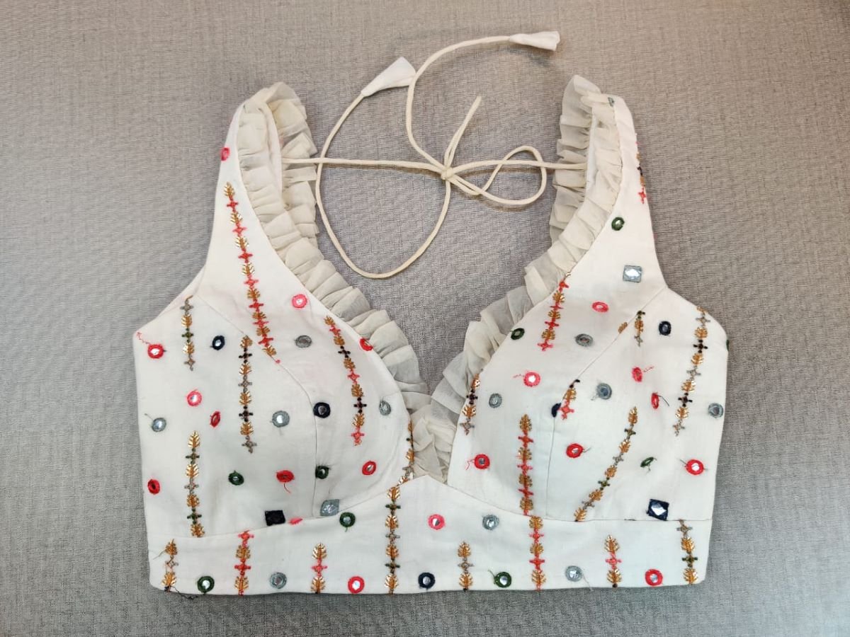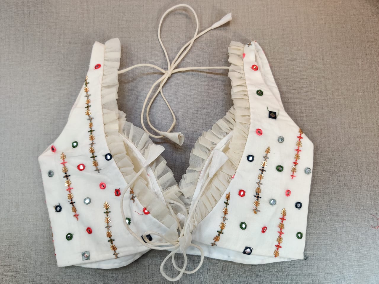 A white blouse with mirror work and beautiful thread embroidery will enhance the look of your contemporary ethnicity. It features a frill neck in front and back, a hook closure at back, and a tie-up. The blouse is a seasonless must-have. Buy this designer blouse in the USA from Pure Elegance.