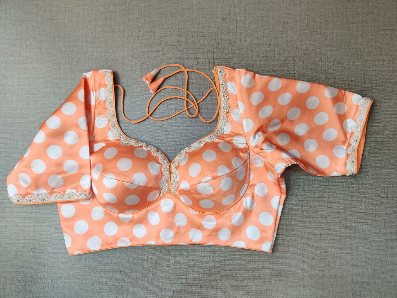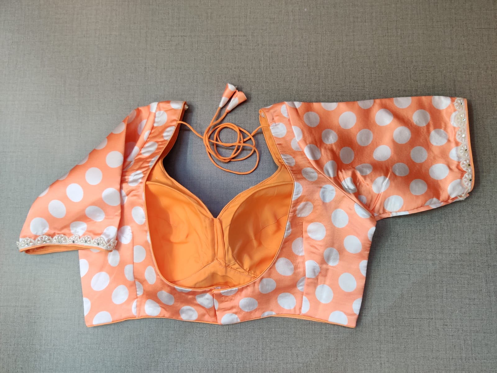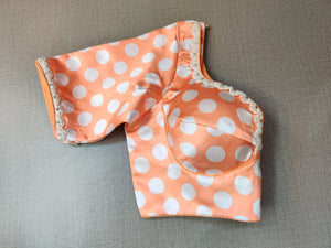 Striking and stylish, this peach blouse will effortlessly elevate your summer looks. Featuring a statement white polka print, the blouse is designed U neck and hook closure and tie up.