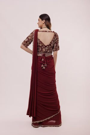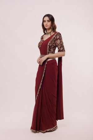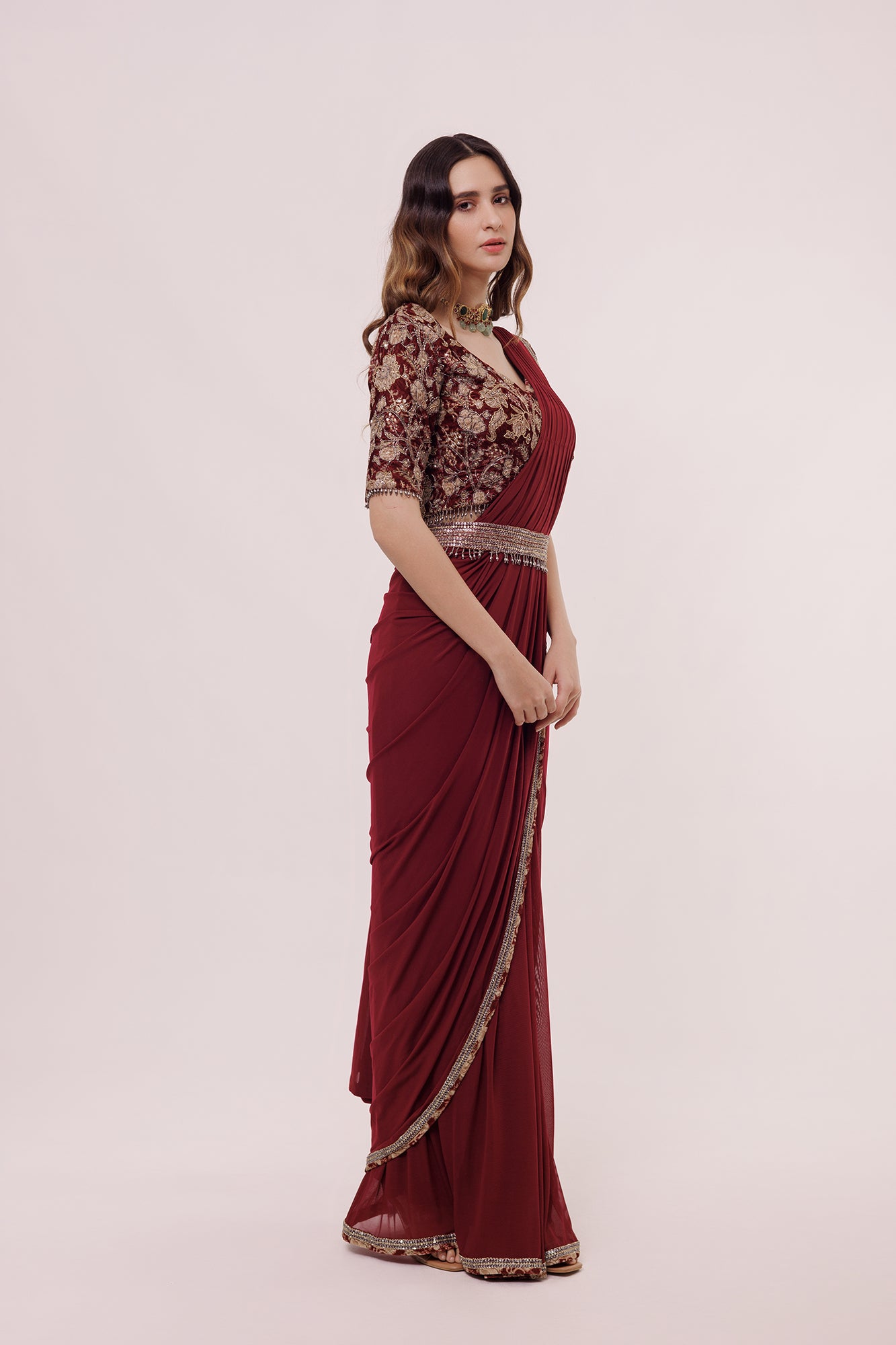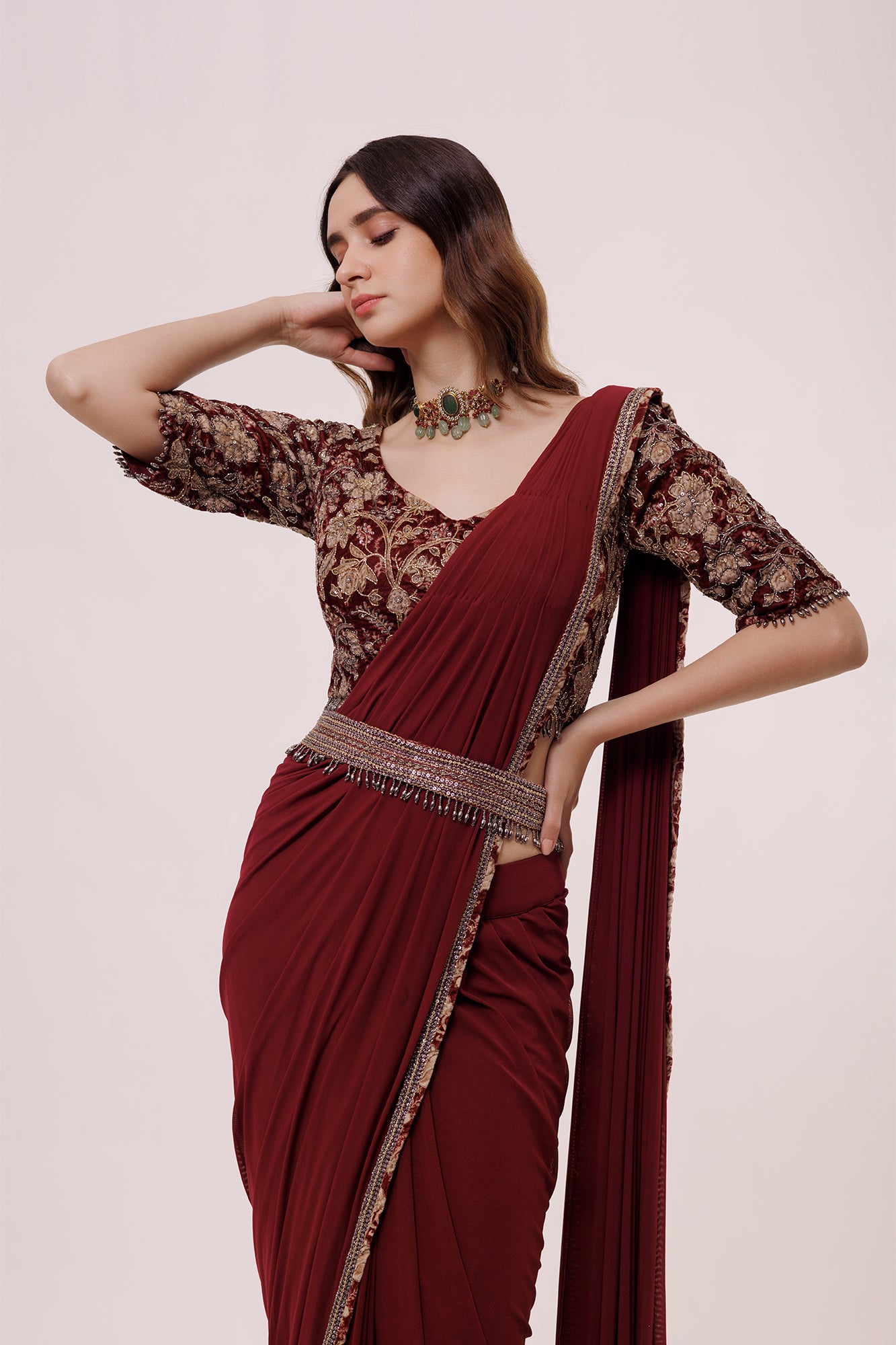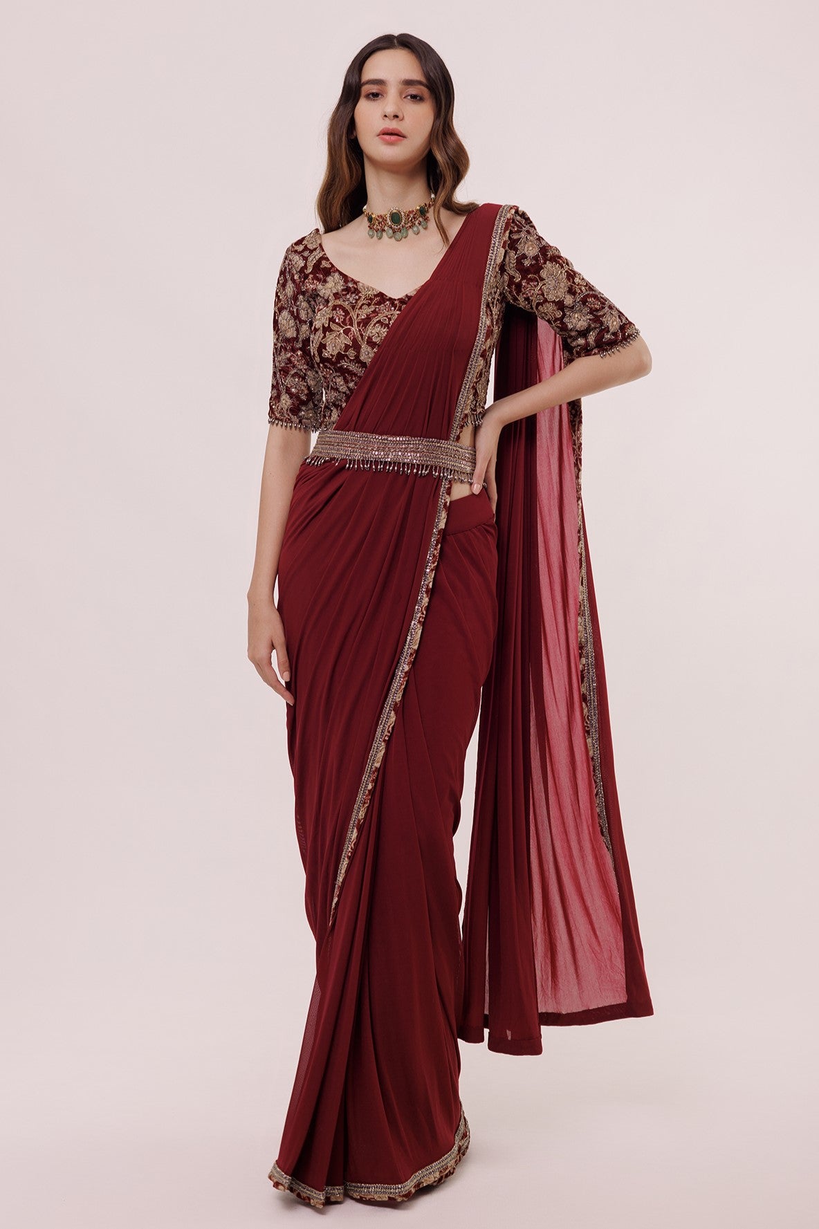 The stylish wine net saree with narrow embellished edges. It comes with an embellished 3/4th sleeve blouse covered with floral embroidery and a narrow belt. Embellishments include sequins, cut dana, and pipe work. Shop designer saris online in the USA from Pure Elegance.