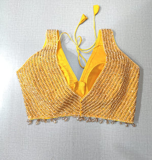 Beautifully designed yellow color pearl embroidered readymade saree blouse. This saree blouse is a must-have piece this wedding season. Wear it with a contrasting saree or even with a contrasting lehenga skirt to complete the look. Buy designer blouse in USA from Pure Elegance.
