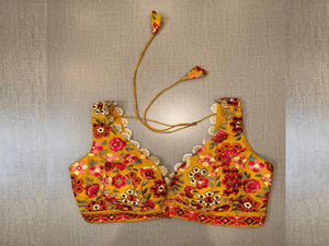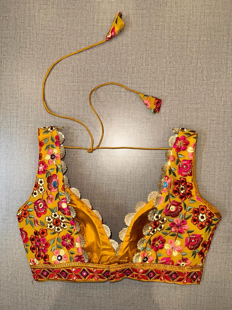 Give your ethnic look a dazzling update with this yellow blouse. Tailored in silk, it features sleeveless, floral embroidery, a V-neck in the front, and hook closure at the back details. Pair it with a complementary solid sari and diamond stud earrings. Buy this designer blouse in the USA from Pure Elegance.