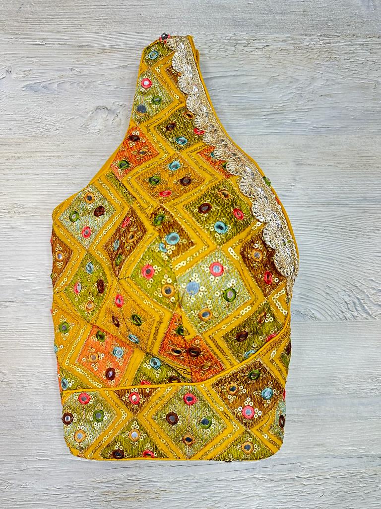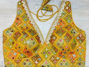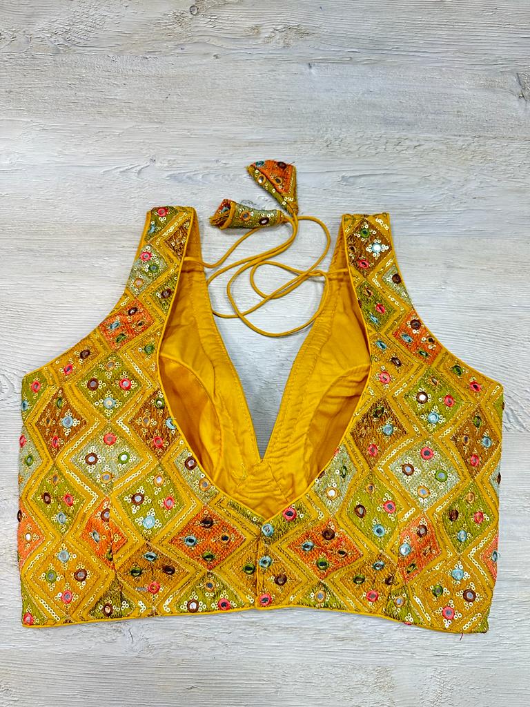 Yellow multicolored embroidered sleeveless blouse features thread & mirror work, hook closure & tie-up at the back. Team this blouse with a contrasting saree to look gorgeous and create a stunning and beautiful look. Buy this designer blouse in the USA from Pure Elegance.