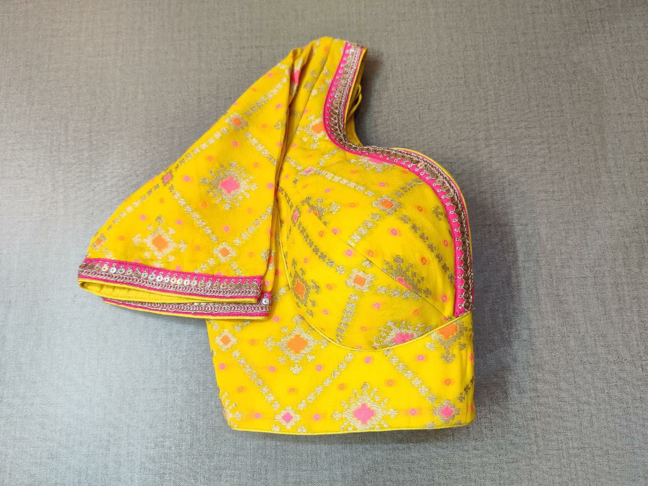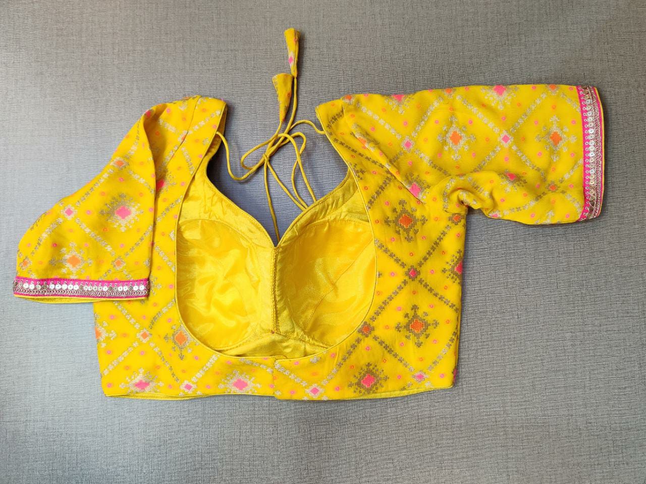 Classic is never old and enough to have in your closet!! Pair this fashionable yellow blouse with beautiful self-embroidery and sequin design on the neck and sleeves borders. Pair this blouse with a statement neck piece and you are good to go! It has a beautiful back with a hook closure and tie-up at back. Buy this designer blouse in the USA from Pure Elegance.