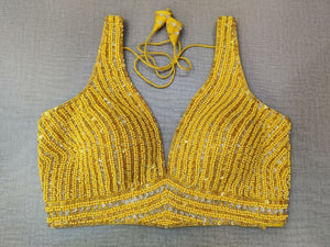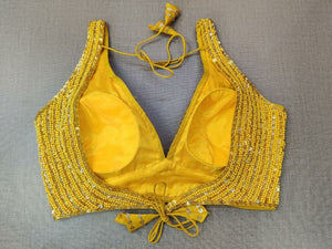 This blouse is a rich add-on to glam up your look. The blouse features a yellow pearl embroidery and tie-up closure at back. Team this blouse with a lovely solid saree to look gorgeous and create a stunning and beautiful look Buy this designer blouse in the USA from Pure Elegance.