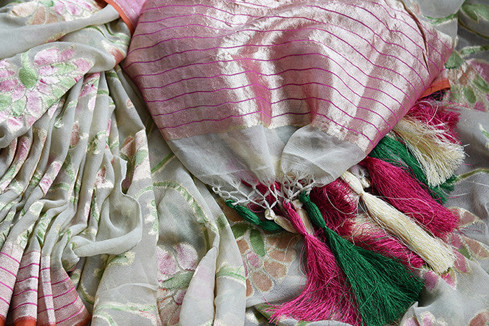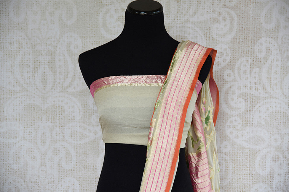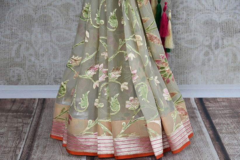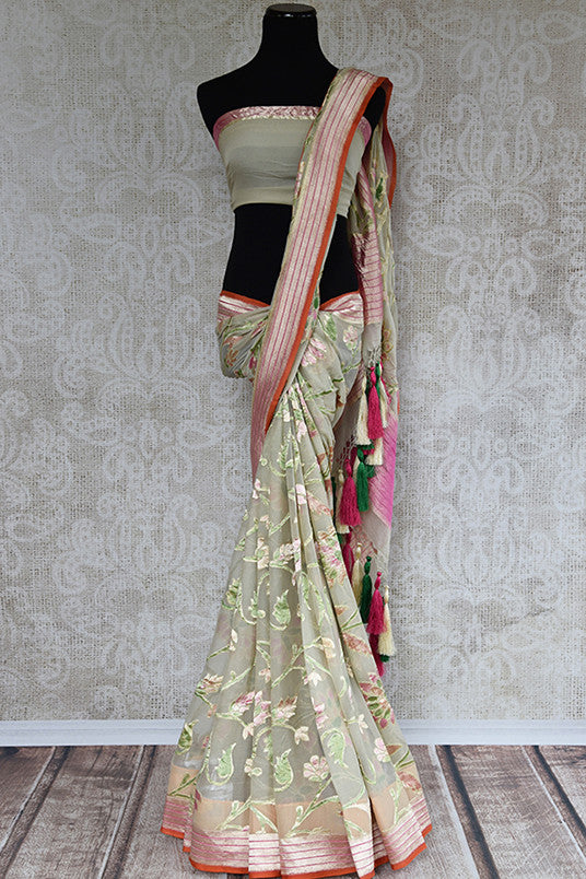 Sage green authentic georgette banarasi saree. This is must have saree for Indian wardrobe and perfect in wedding parties.