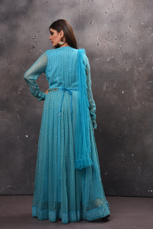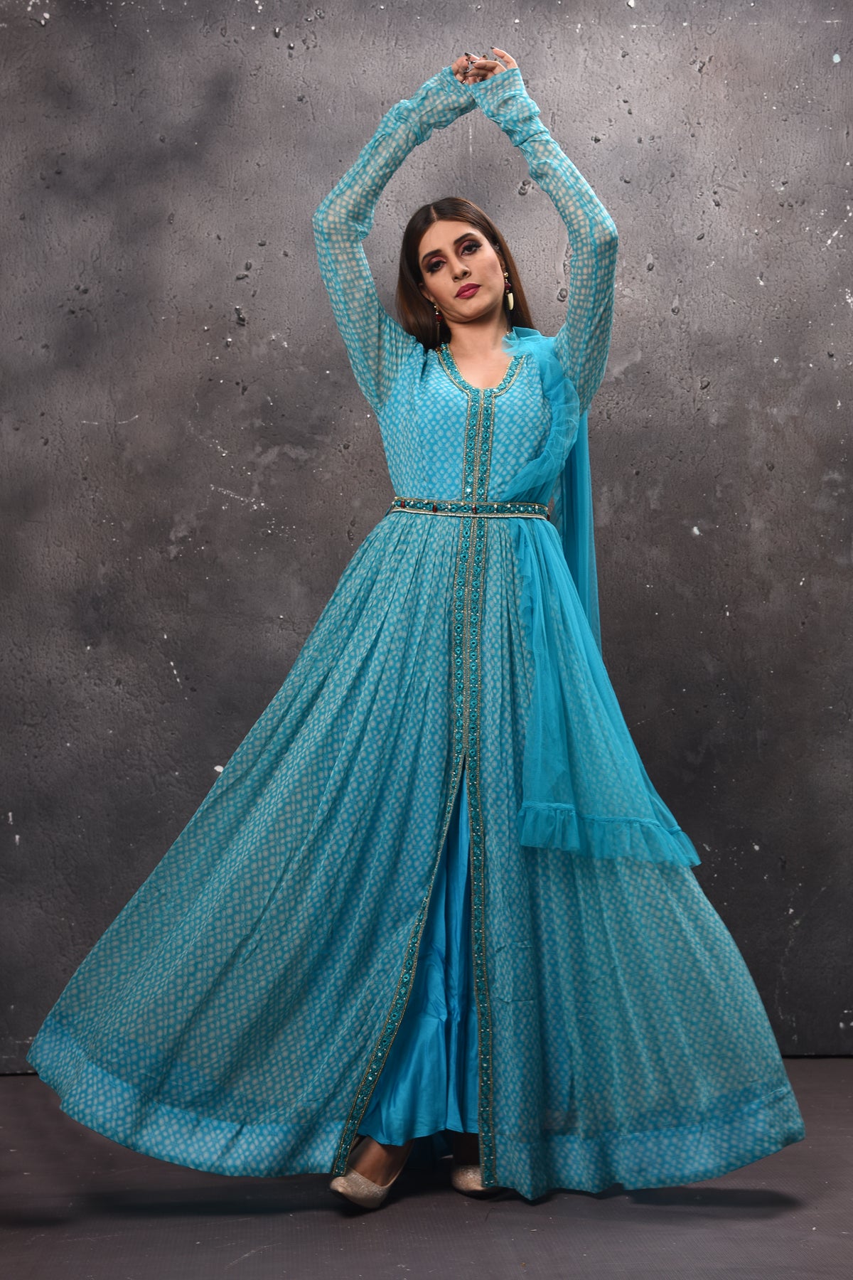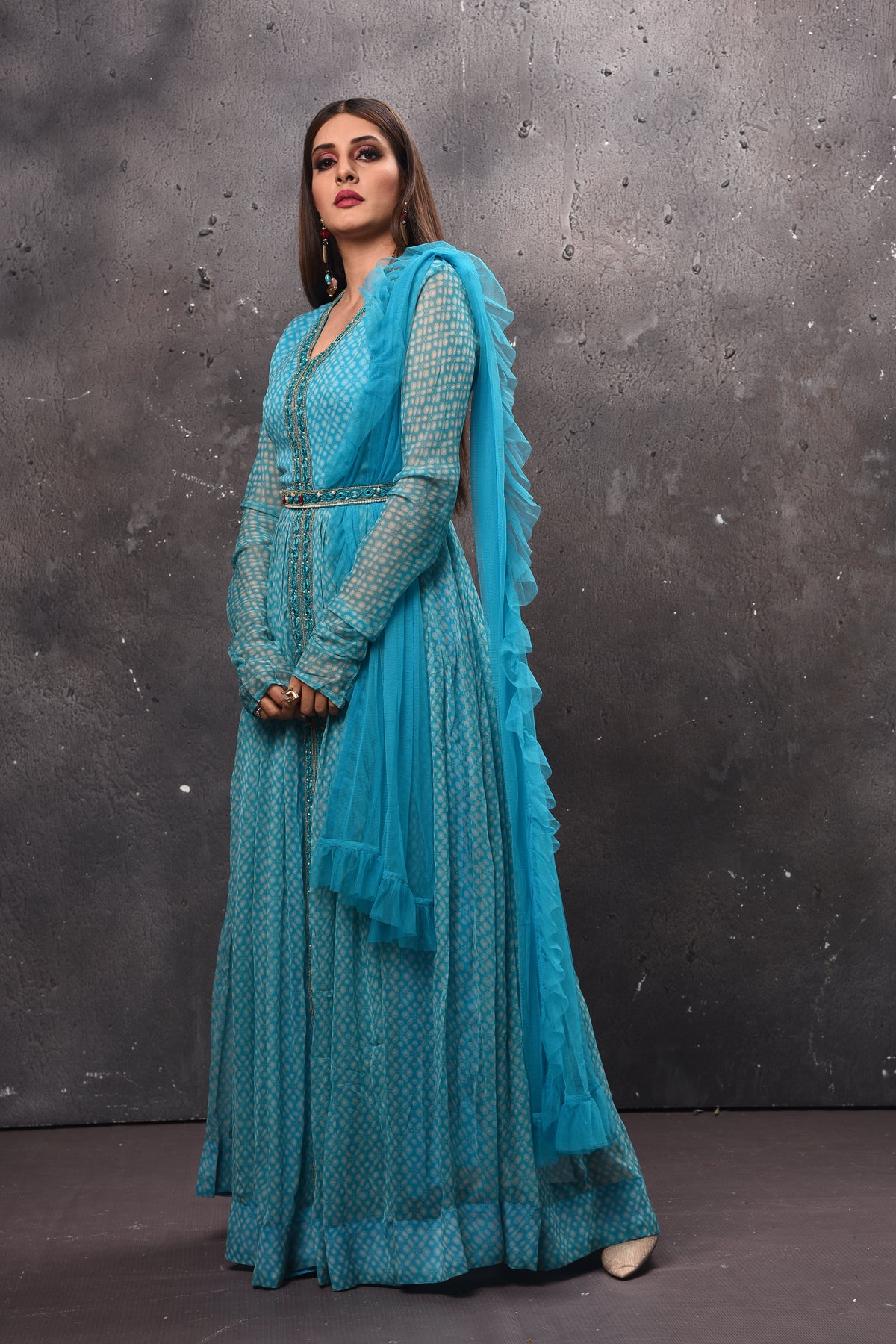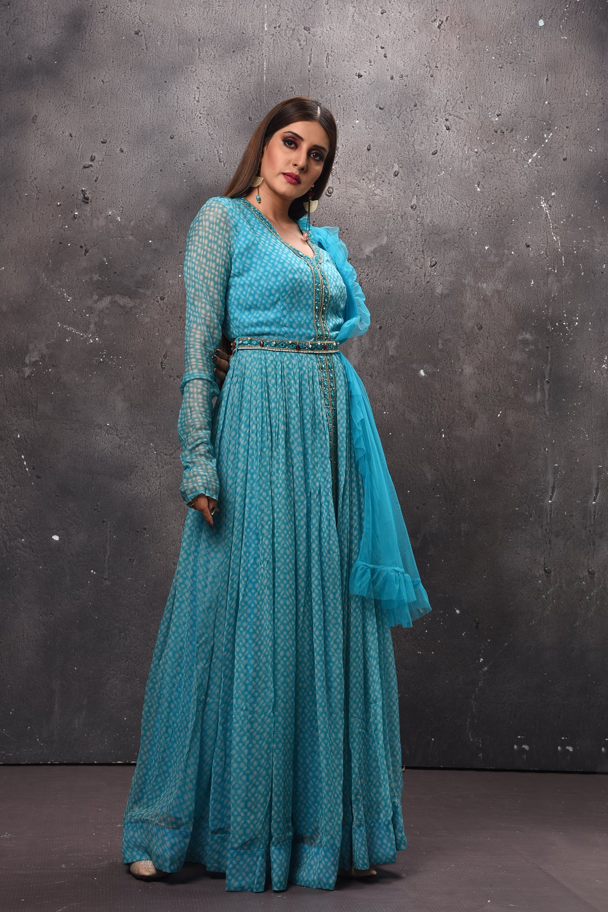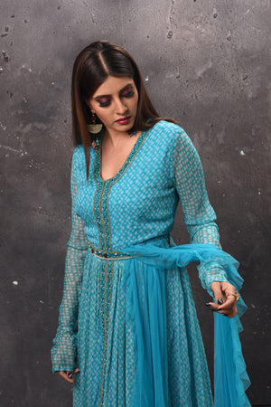 Be the center of attraction in this beautiful blue belted Anarkali with dupatta