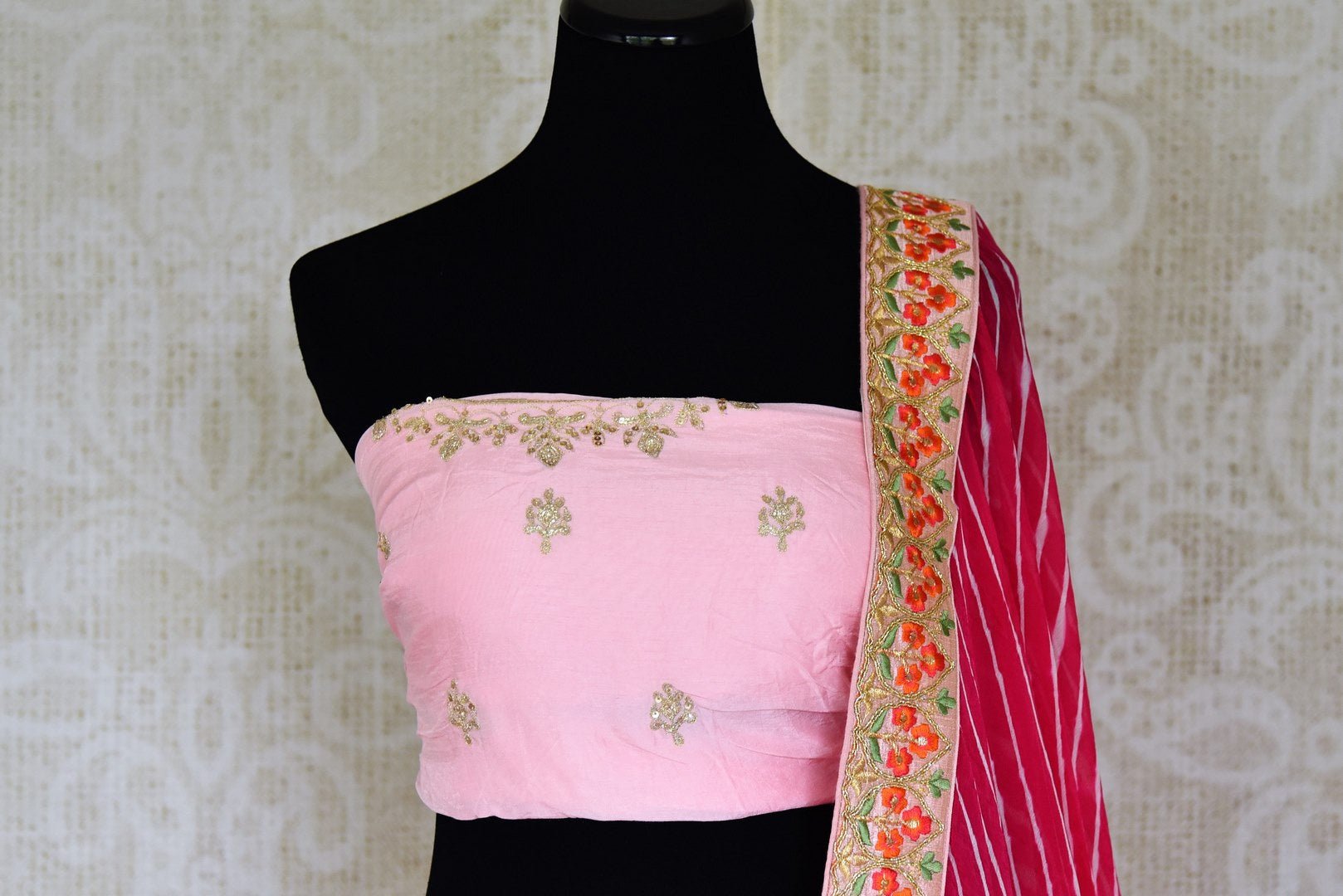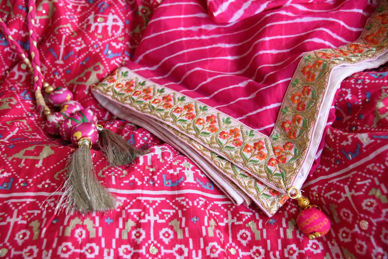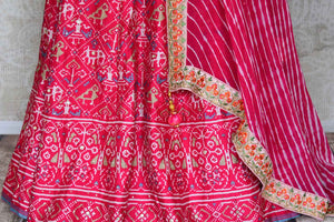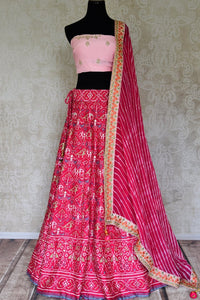 Go for a captivating guest wedding look with this beautiful bright pink ikkat lehenga. It comes with a contrasting tie-dye pink color embroidered dupatta and unstitched blouse piece. Shop online at Pure Elegance or visit our store in USA!