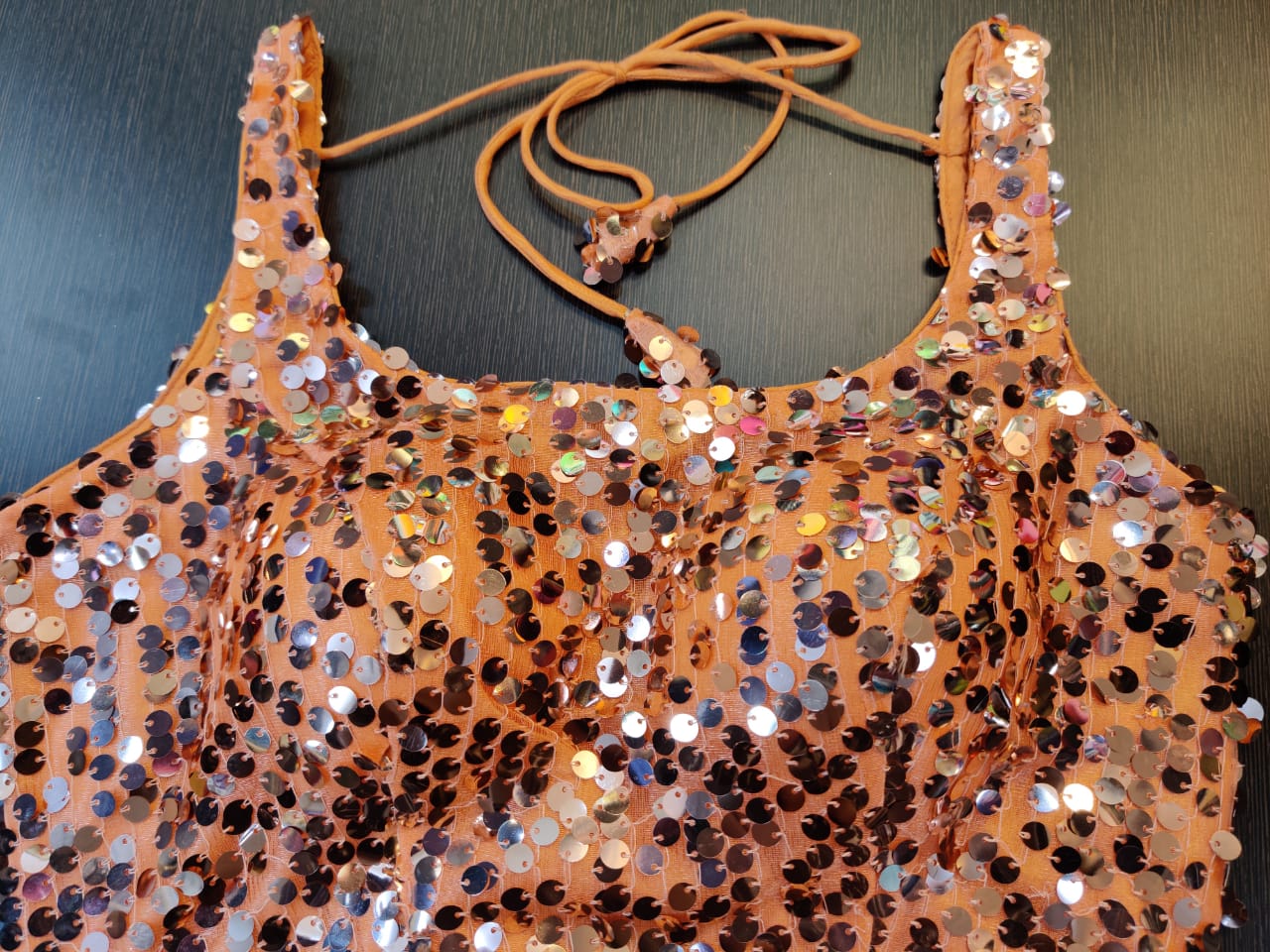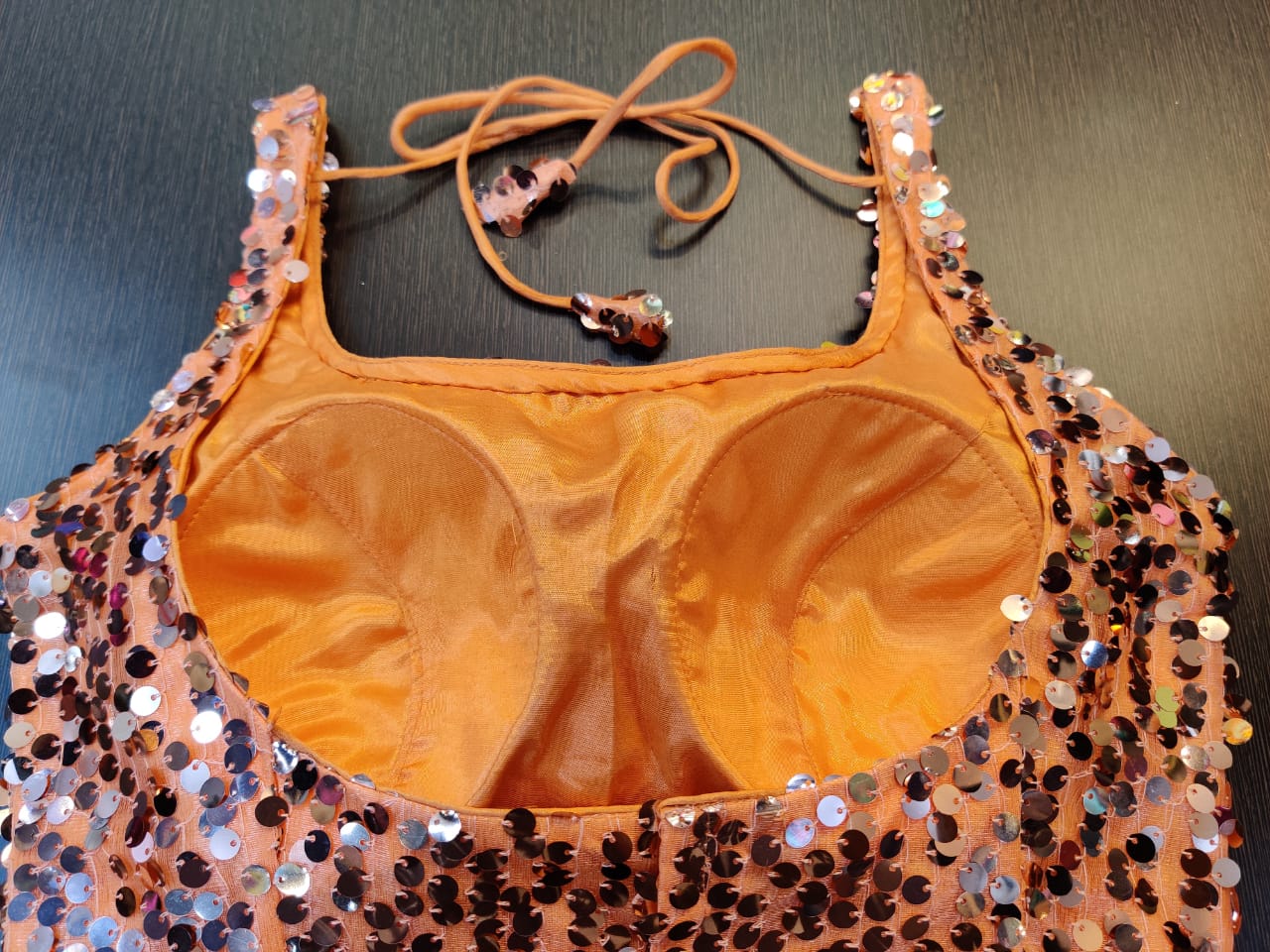 Stunning orange designer sequin saree blouse. Buy online from Pure Elegance